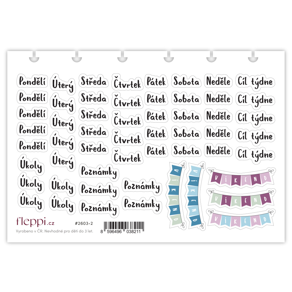 Arch pro bullet journal. Obsahuje názvy dnů, nadpisy Cíl týdne, Úkoly a Poznámky a dekorativní víkendové bannery.