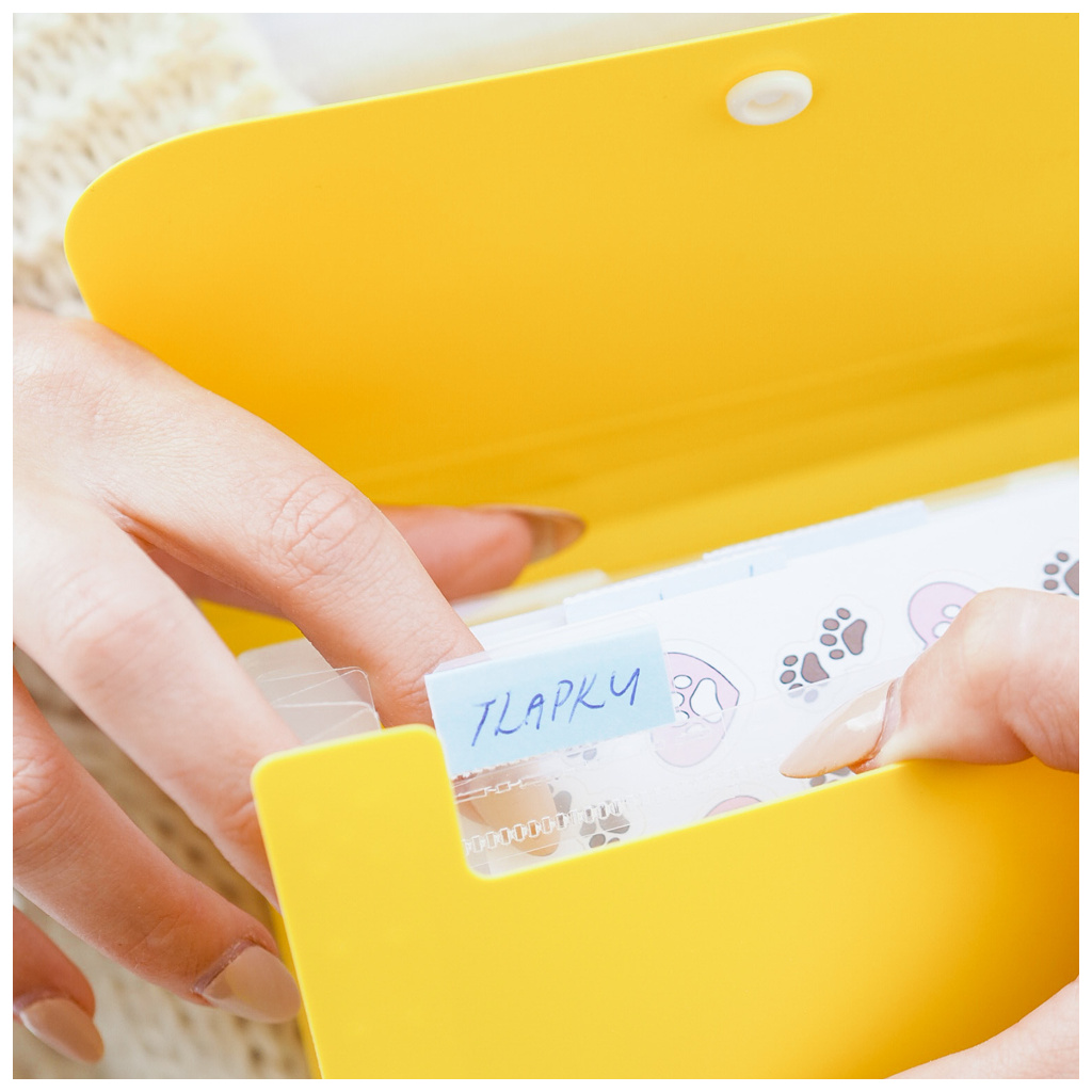 Desky na samolepky slouží pro praktické přenášení, organizaci a třídění všech vašich samolepek. Obsahuje 12 roztažitelných přihrádek se štítky pro popis, zavírání na klopu a druk.