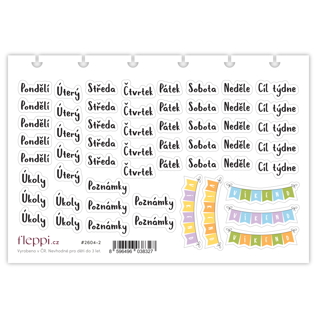 Arch pro bullet journal. Obsahuje názvy dnů, nadpisy Cíl týdne, Úkoly a Poznámky a dekorativní víkendové bannery.
