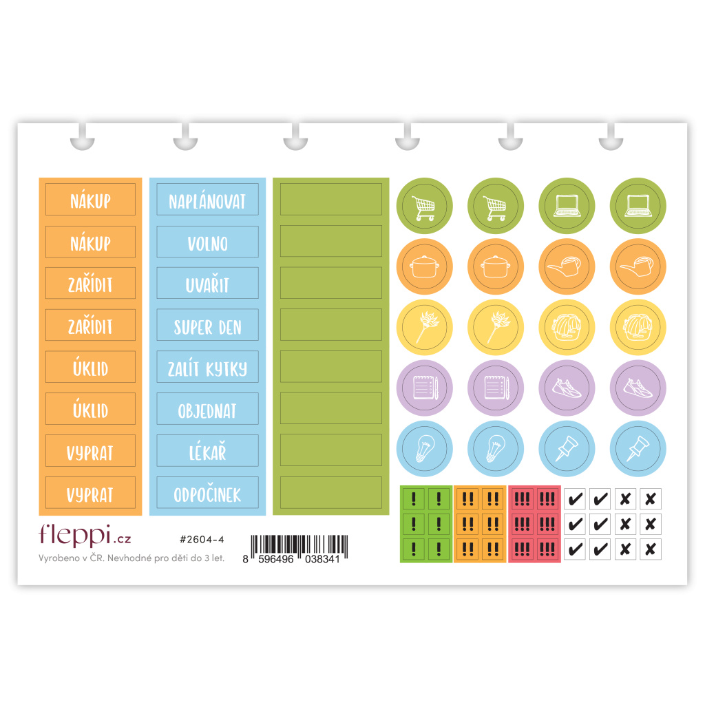 Arch obsahuje ikonkové a textové samolepky, prázdná políčka, na která si můžete dopsat vlastní texty, samolepky pro určování priorit úkolů (! malá priorita, !! střední priorita, !!! vysoká priorita) a označení jejich dokončení nebo zrušení.