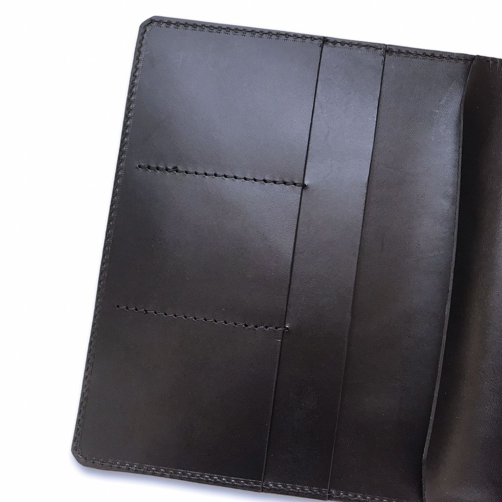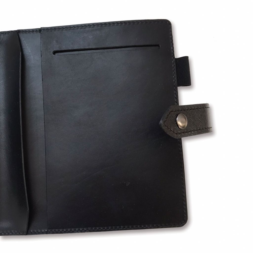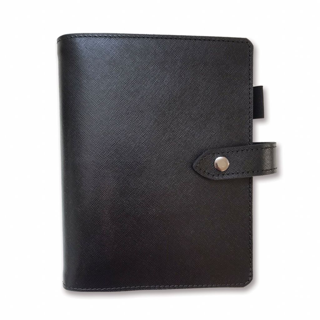 Desky diáře jsou vyrobeny z černé Saffiano kůže. Skvěle pasuje na zápisníky velikosti B6 nebo HP mini diáře. Zapínání diáře je na patent. Uvnitř najdete na pravé straně kapsu na poznámkový blok a na levé straně 3 malé kapsy na vaše nezbytnosti.