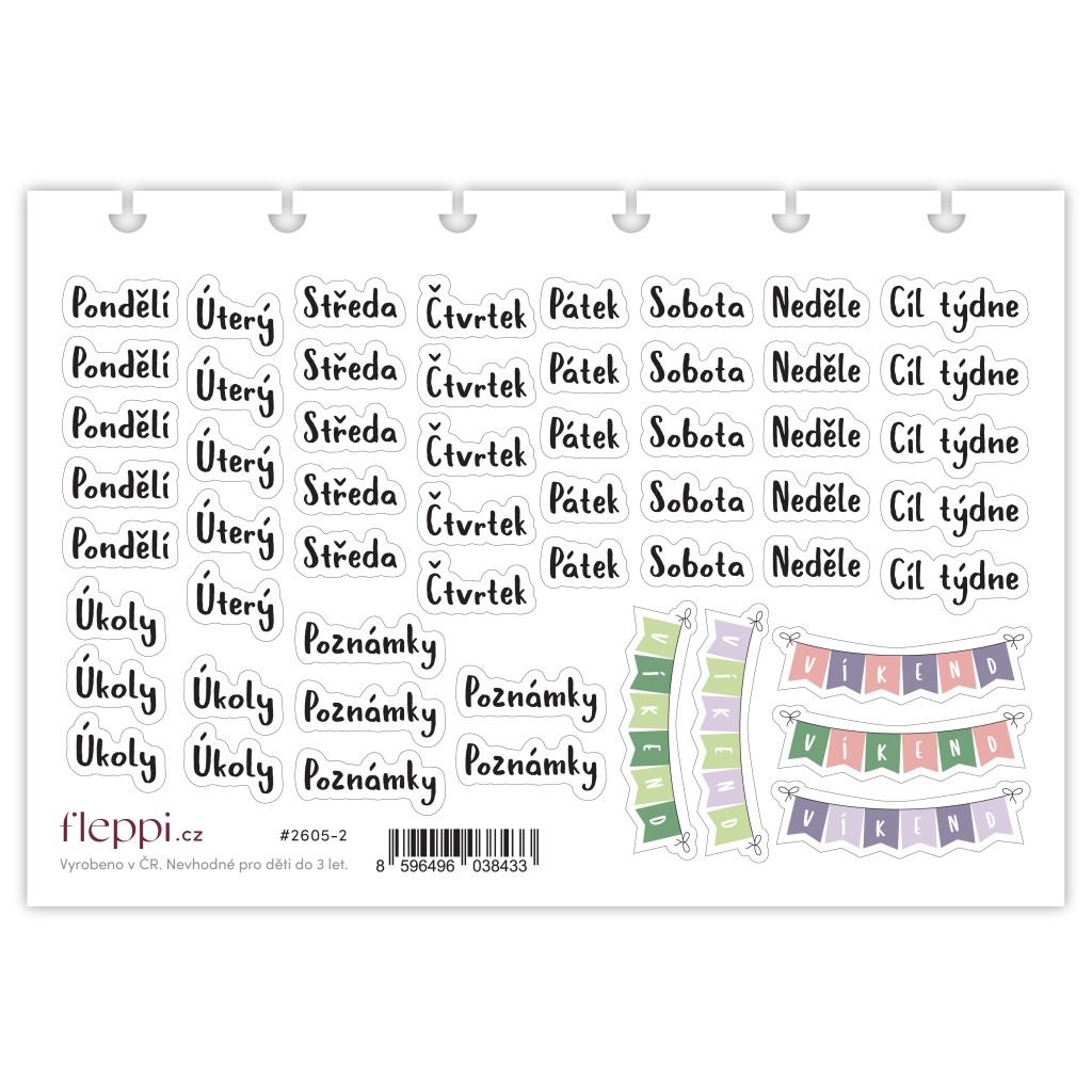 Arch pro bullet journal. Obsahuje názvy dnů, nadpisy Cíl týdne, Úkoly a Poznámky a dekorativní víkendové bannery.