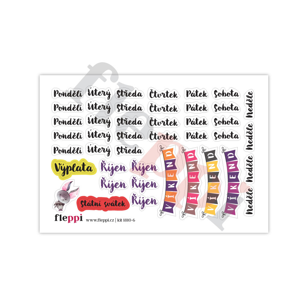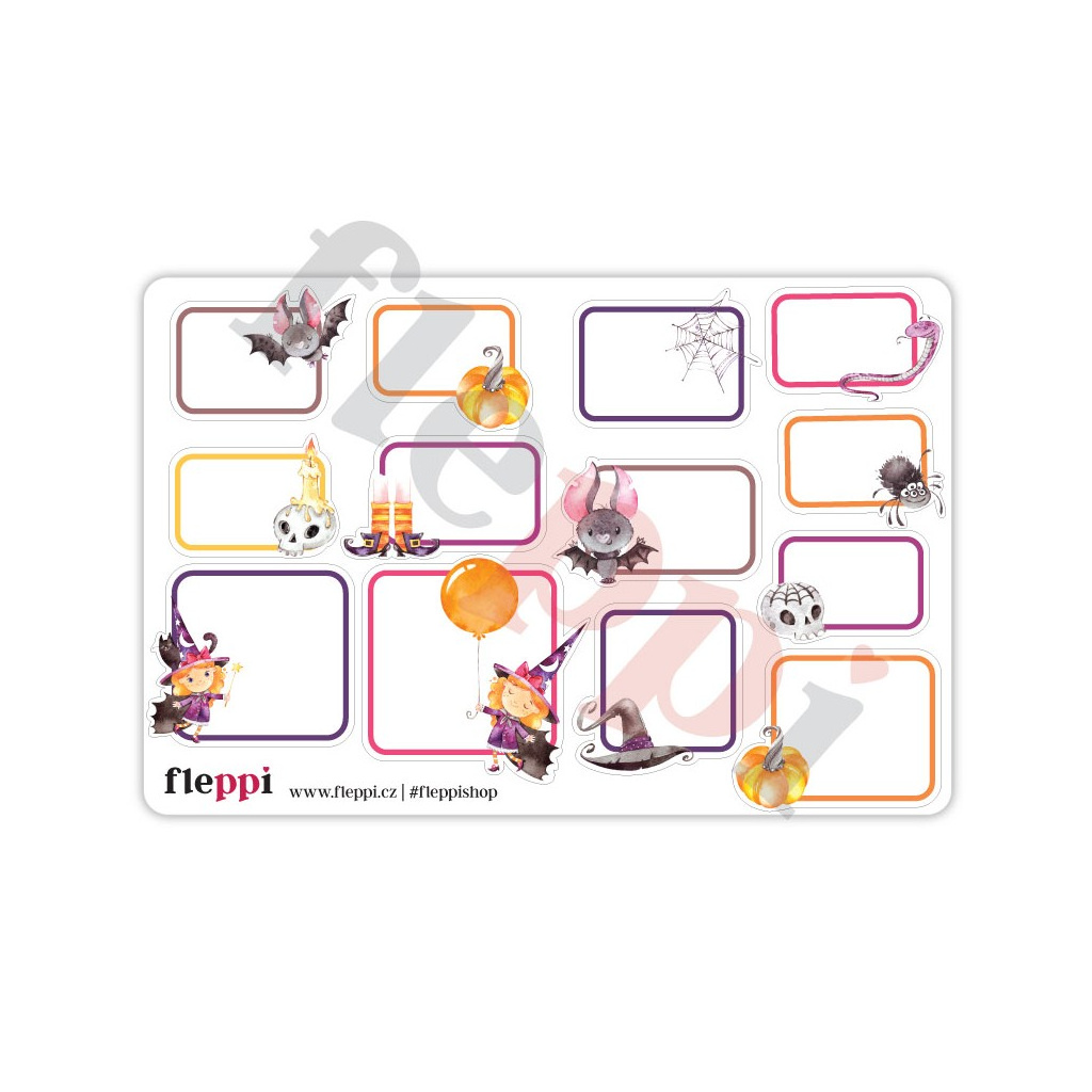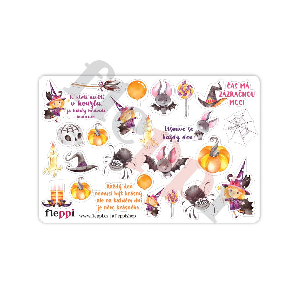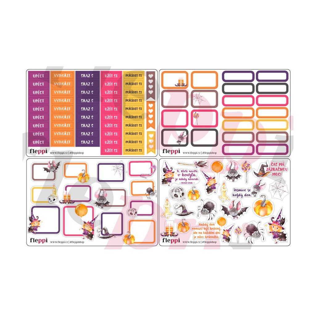 Říjnový samolepkový kit se nese ve znamení Halloweenu. Najdete v něm malou čarodějnici, roztomilé netopýry a pavoučky a nechybí ani dýně.