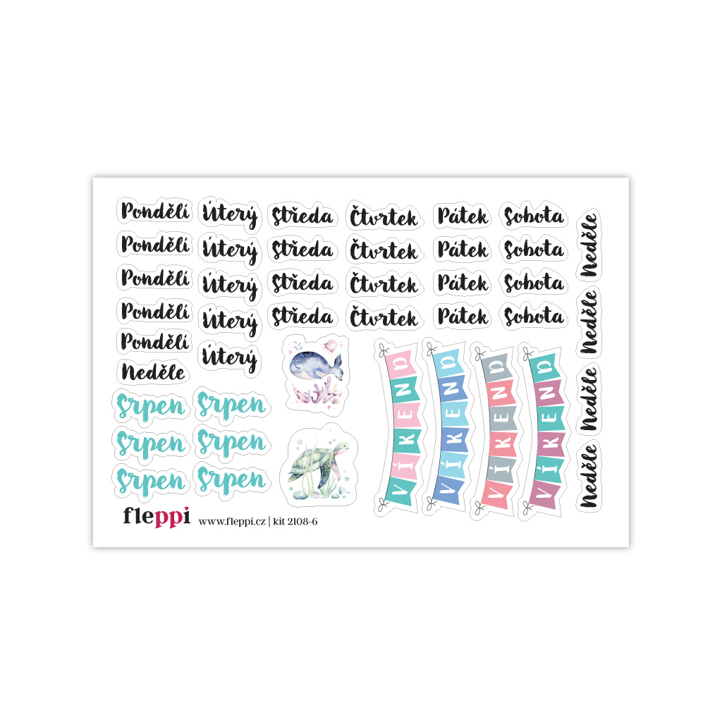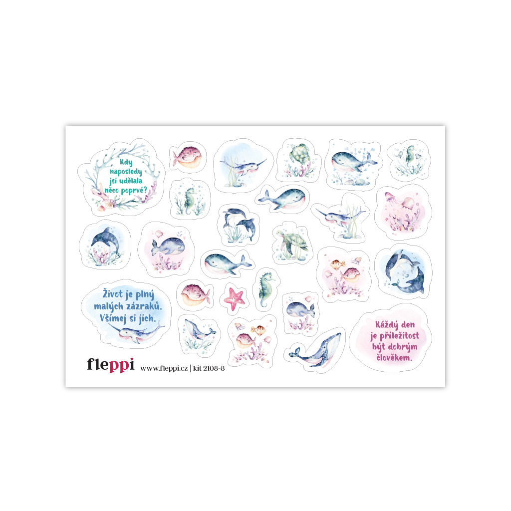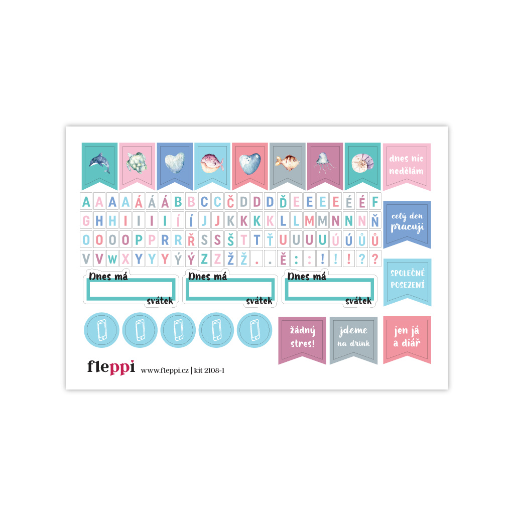 Poslední letní samolepkový kit roku 2021 vás zavede do hlubin oceánu a pomůže vám přenést krásy podmořského života do vašeho diáře. Něžné odstíny modré a růžové barvy v kombinaci s jemnými obrázky jistě nadchnou každou nadšenou milovnici plánování.