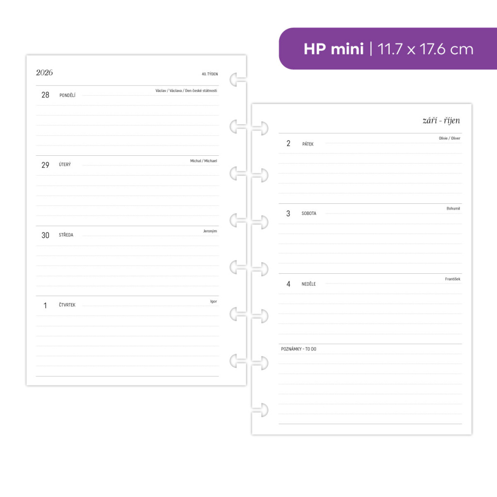 Začněte rok 2026 s diářem, který se přizpůsobí vašemu stylu plánování. Tato náplň nabízí praktické horizontální uspořádání týdne na dvě strany a linkované dny, které vám pomohou snadno uspořádat váš čas i myšlenky. Je ideální pro každého, kdo potřebuje mít všechny své plány přehledně na jednom místě. Tento typ kalendáře je jedním z nejoblíbenějších rozvržení mezi našimi zákazníky.