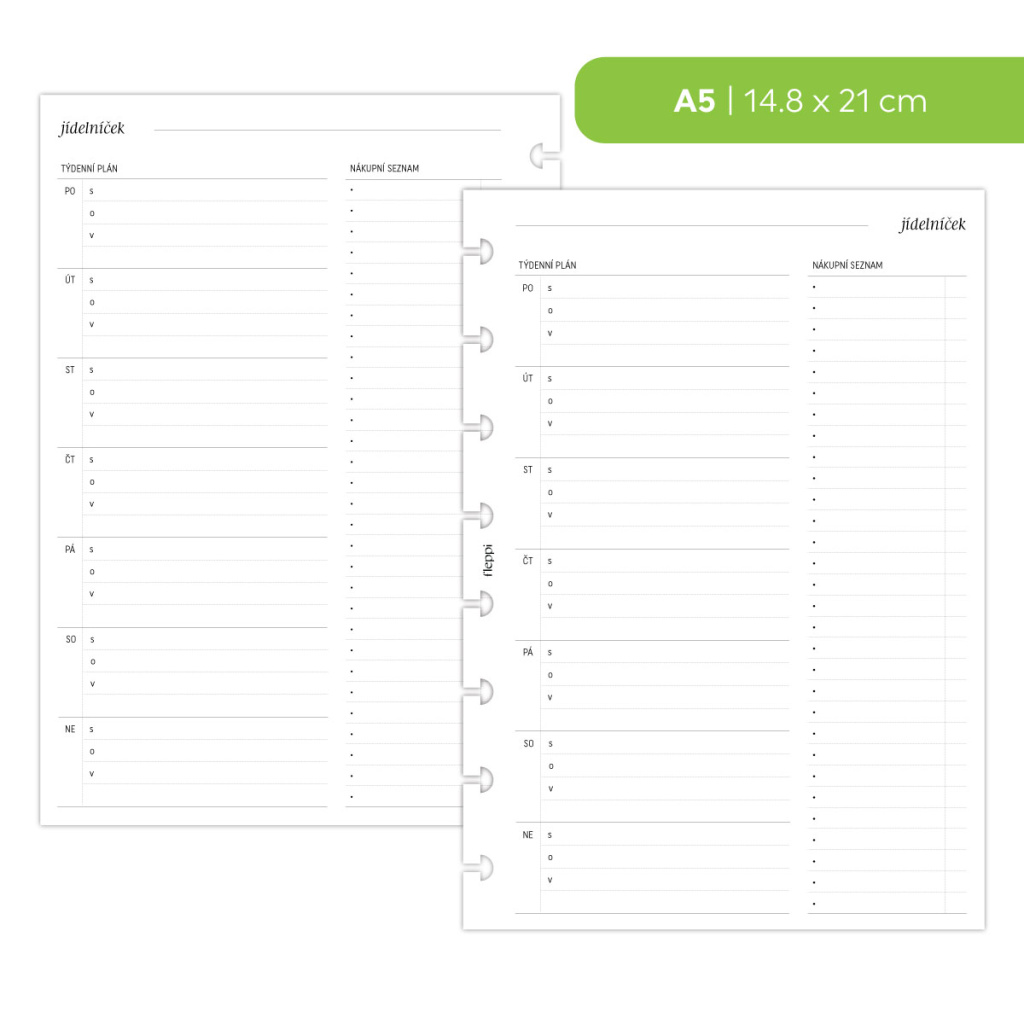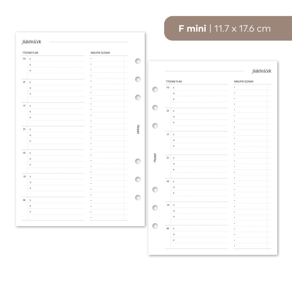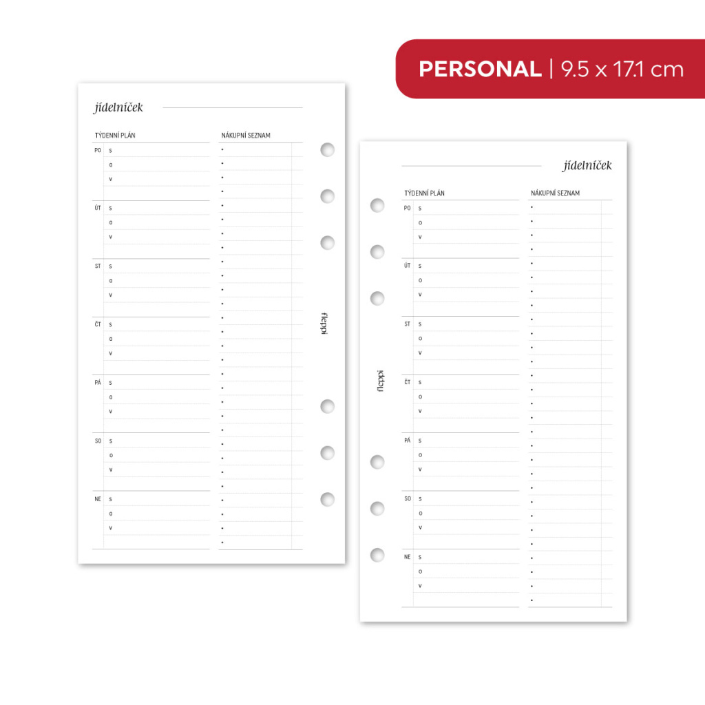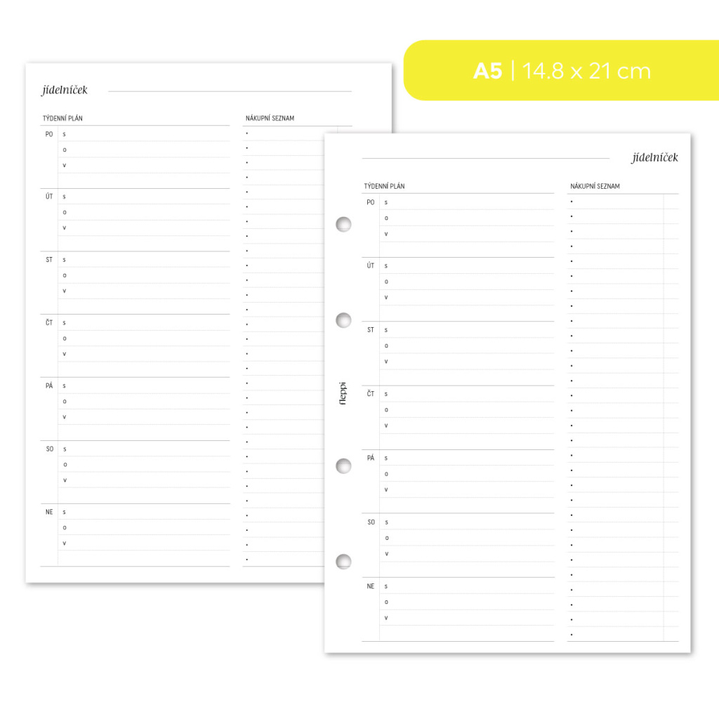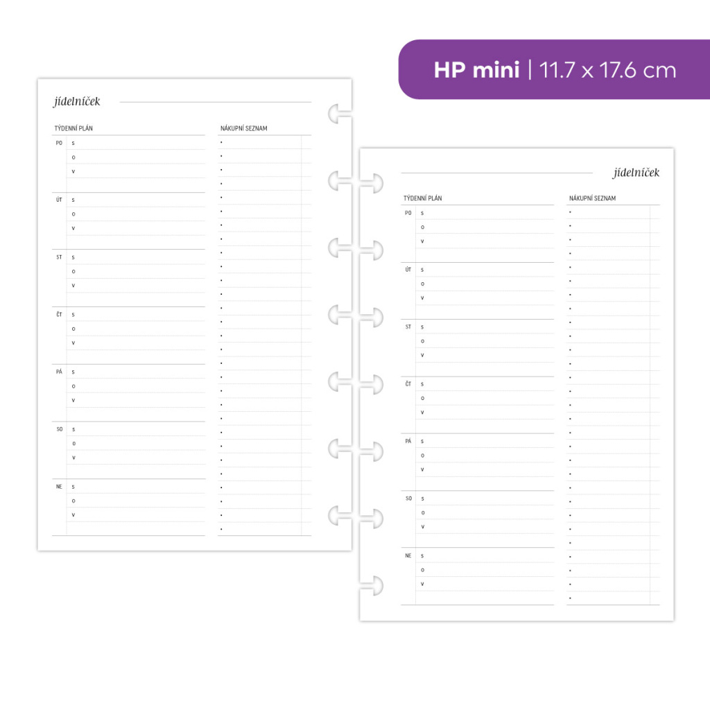 Tato náplň do diáře vám pomůže přenést plánování jídel z hlavy na papír a udělat z něj přehlednou a zvládnutelnou součást týdne. Na jedné stránce si rozepíšete jídla na jednotlivé dny a zároveň máte prostor pro nákupní seznam, který s plánem přímo souvisí. Vše je na jednom místě, bez přeskakování mezi poznámkami, aplikacemi a lístečky.
