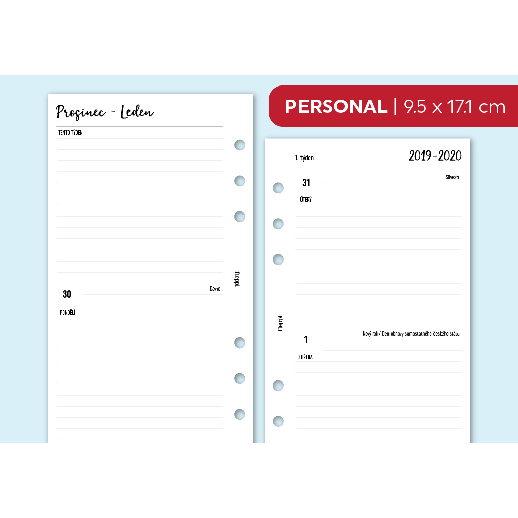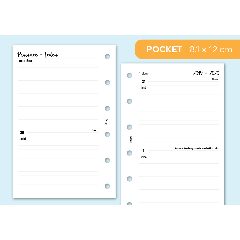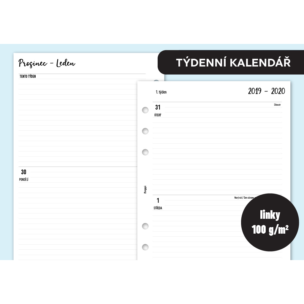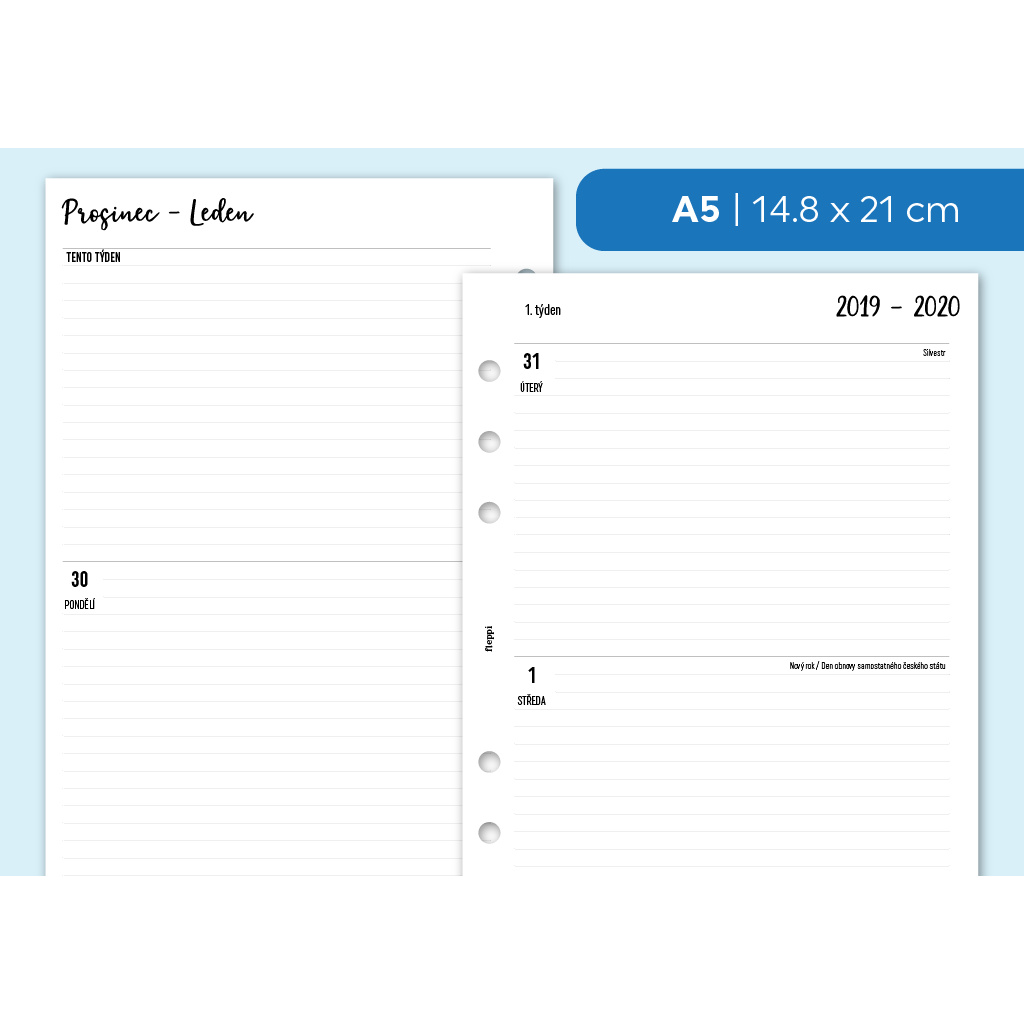 Náhradní náplň do diáře s týdenním kalendářem na rok 2020. Rozložení týdne je na čtyři strany neboli dva dny na stranu s horizontálním zobrazením dnů. Na výběr je ve verzi linkované a čisté. Součástí náplně jsou i další listy pro vaše plánování.