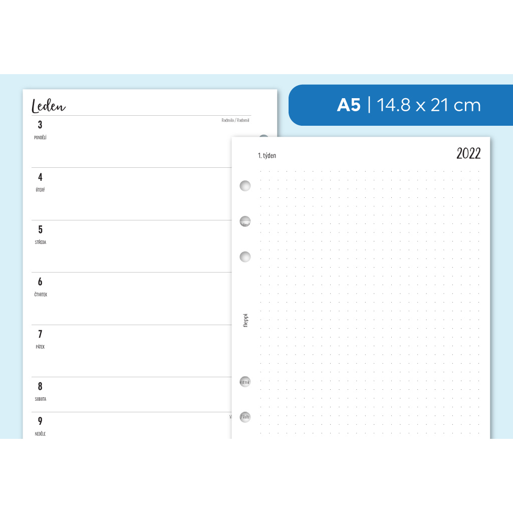 Náhradní náplň do diáře s týdenním kalendářem na rok 2022. Rozložení náplně je týden na levé straně a prostor pro poznámky na pravé straně. Týden obsahuje čisté listy, poznámky jsou tečkované.. Součástí náplně jsou i další listy pro vaše plánování.