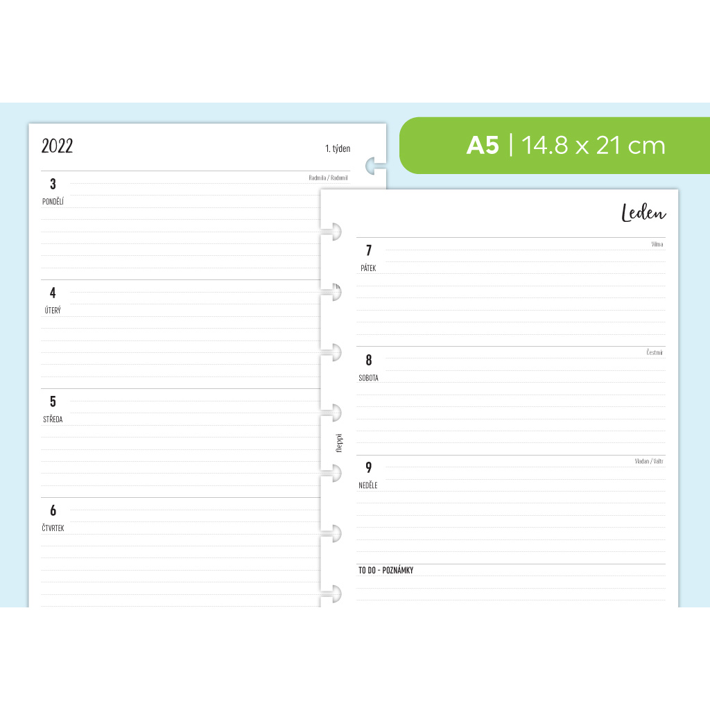 Náhradní náplň do diáře s týdenním kalendářem na rok 2022. Rozložení týdne je na dvě strany s horizontálním zobrazením dnů. Tato je ve verzi linkované dny. Součástí náplně jsou i další listy pro vaše plánování.