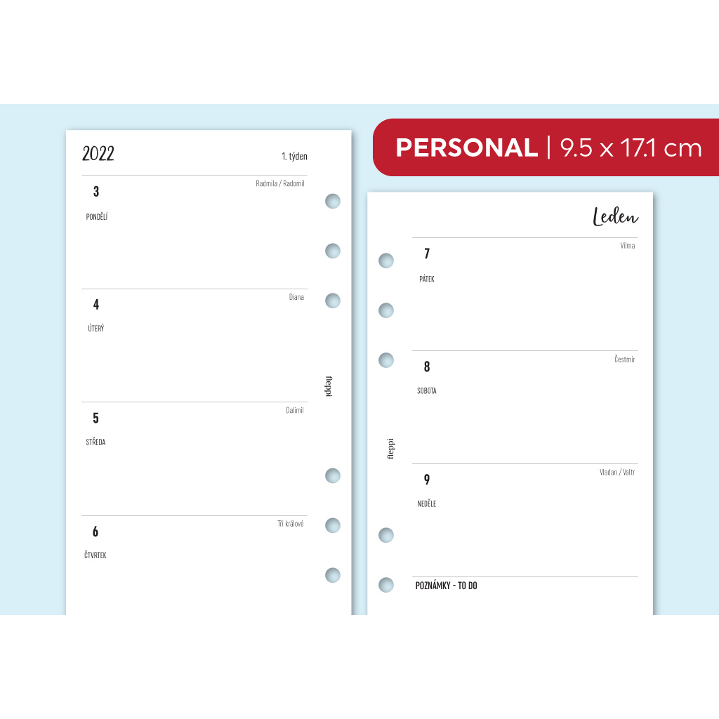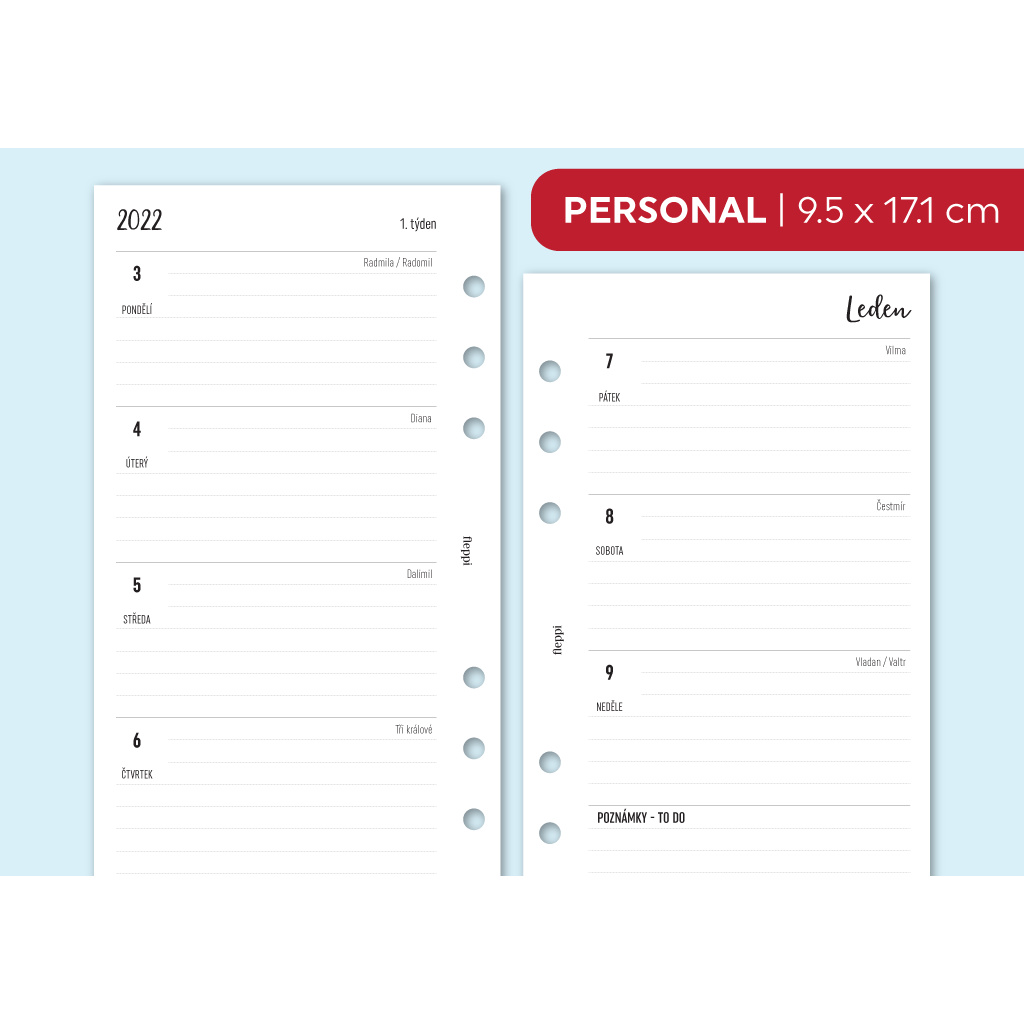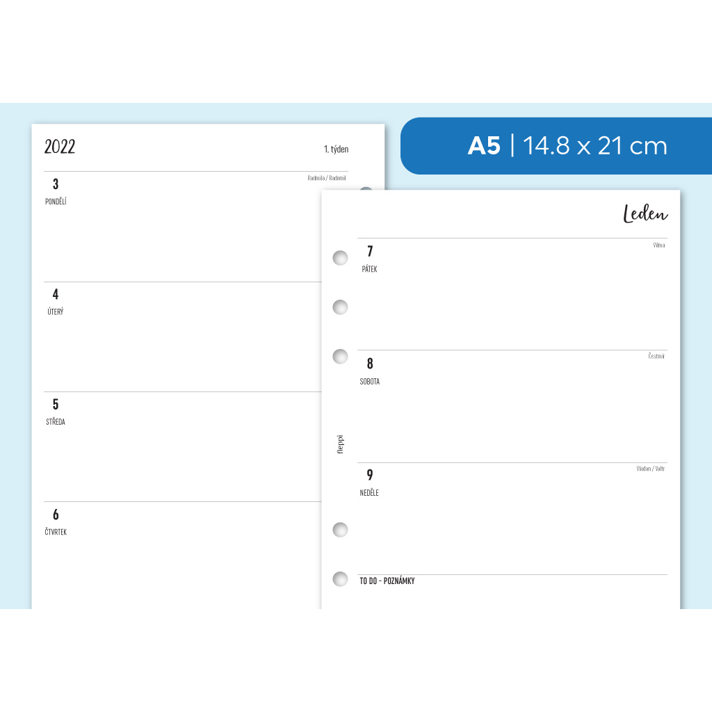 Náhradní náplň do diáře s týdenním kalendářem na rok 2022. Rozložení týdne je na dvě strany s horizontálním zobrazením dnů. Na výběr je ve verzi linkované a čisté. Součástí náplně jsou i další listy pro vaše plánování.