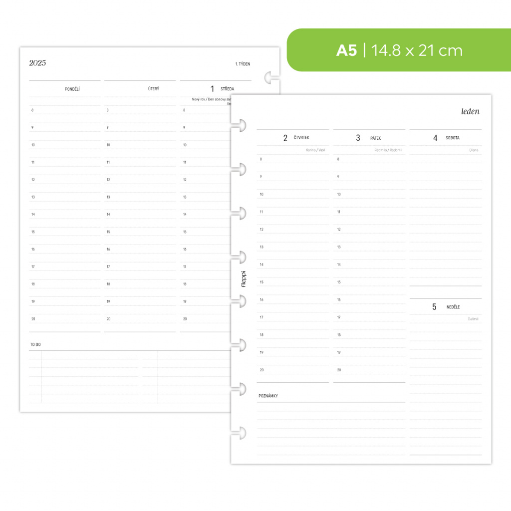 Vstupte do roku 2025 s diářem, který podpoří váš systém organizace. Tato náplň přináší přehledné vertikální uspořádání týdne na dvě strany, kde každý den má vyhrazený prostor s časovým rozvržením. Linkované řádky pomáhají strukturovat poznámky i úkoly, takže si snadno naplánujete den od rána do večera. Tento formát ocení každý, kdo chce mít jasný přehled o svém harmonogramu a efektivně řídit svůj čas. Tento kalendáře je jedním z nejoblíbenějších rozvržení mezi našimi zákazníky.