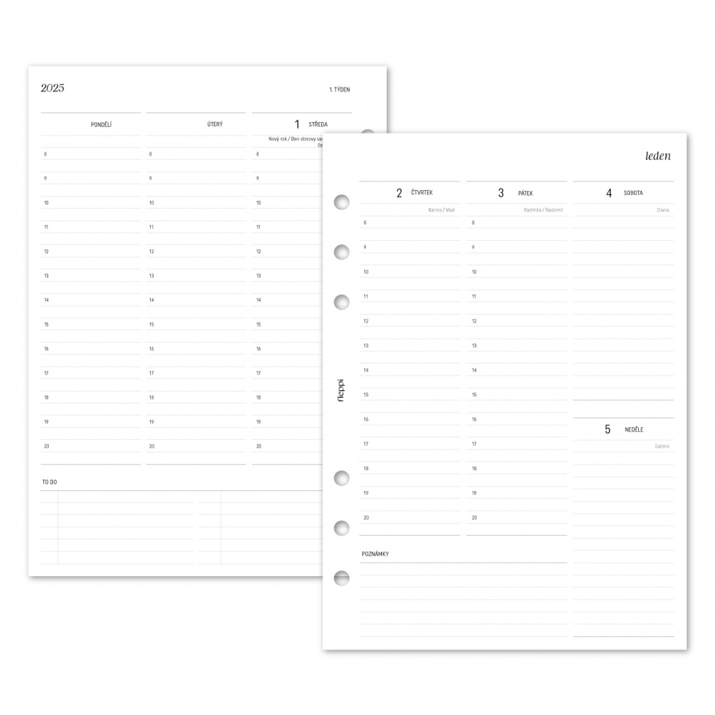 Tato náplň do diáře není jen o týdenním kalendáři – nabízí vám mnohem víc. Na začátku vás čeká úvodní stránka, kam si můžete zapsat své jméno a kontakt, aby se vám mohl diář v případě ztráty opět vrátit. Dále obsahuje praktický list pro zaznamenání důležitých informací, jako je vaše adresa, e-mail, telefonní číslo, číslo účtu nebo kontakty související se zaměstnáním, podnikáním či školou. Součástí je také rychlý přehled celého roku, který vám umožní snadno si naplánovat dlouhodobé události. Nechybí ani výpis státních svátků a volných dnů, takže budete mít všechny důležité termíny na očích. Pro každého, kdo si potřebuje zaznamenat důležité termíny nebo informace k jednotlivým měsícům, je zde přehledná dvoustrana – ideální pro rychlý zápis klíčových dat či plánů. Na konci náplně najdete několik volných listů pro vaše poznámky, kam můžete zapisovat cokoli, co vás napadne.
