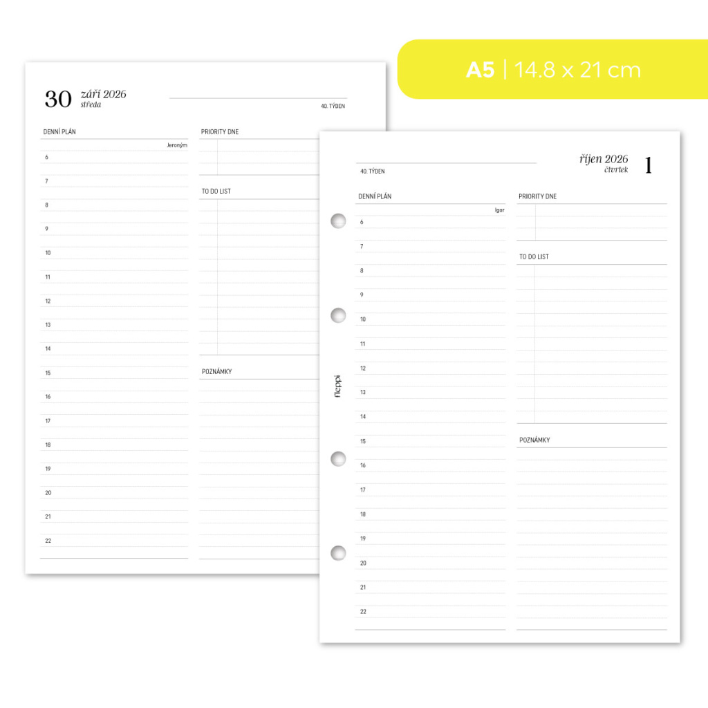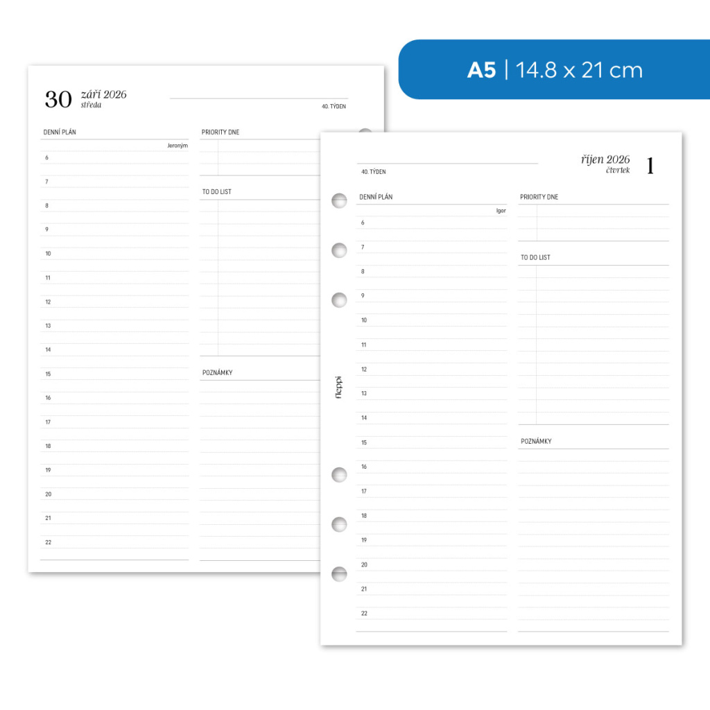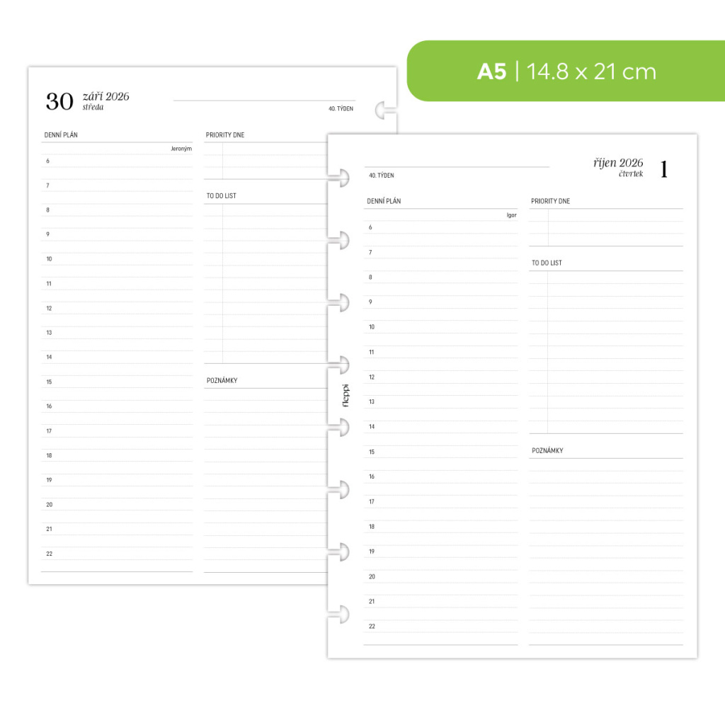 Tato náplň je ideální pro všechny, kdo potřebují každý den detailně rozplánovat a mít dostatek místa na zápisky. Hodí se pro pracovní i osobní plánování, ať už si vedete diář kvůli důležitým schůzkám, denním úkolům, nebo třeba zapisujete své myšlenky a nápady. Linkované stránky poskytují strukturu, která pomůže udržet pořádek ve vašich poznámkách, a díky samostatné stránce pro každý pracovní den máte jistotu, že se vám vejde vše podstatné – od krátkých úkolů až po obsáhlé to-do listy. Pokud hledáte náplň, která vám umožní být maximálně organizovaní a zároveň vám poskytne svobodu v plánování, tato varianta je pro vás ideální.
