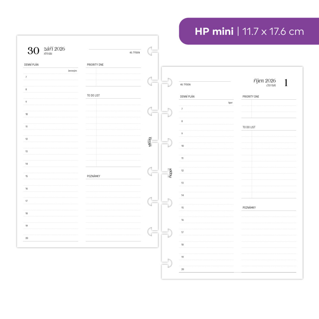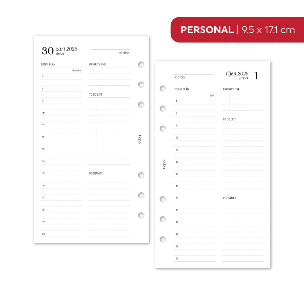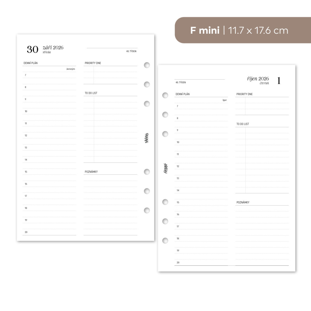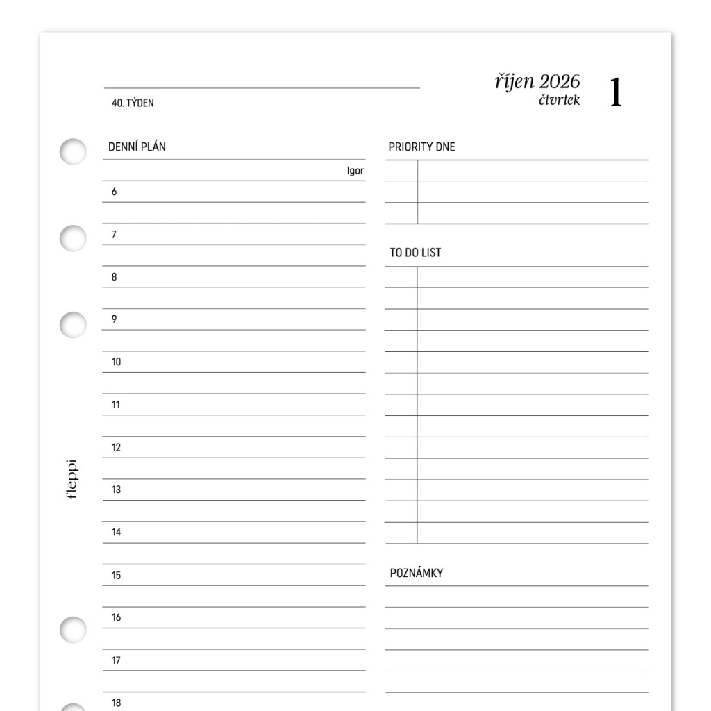 Tato náplň je ideální pro všechny, kdo potřebují každý den detailně rozplánovat a mít dostatek místa na zápisky. Hodí se pro pracovní i osobní plánování, ať už si vedete diář kvůli důležitým schůzkám, denním úkolům, nebo třeba zapisujete své myšlenky a nápady. Linkované stránky poskytují strukturu, která pomůže udržet pořádek ve vašich poznámkách, a díky samostatné stránce pro každý pracovní den máte jistotu, že se vám vejde vše podstatné – od krátkých úkolů až po obsáhlé to-do listy. Pokud hledáte náplň, která vám umožní být maximálně organizovaní a zároveň vám poskytne svobodu v plánování, tato varianta je pro vás ideální.