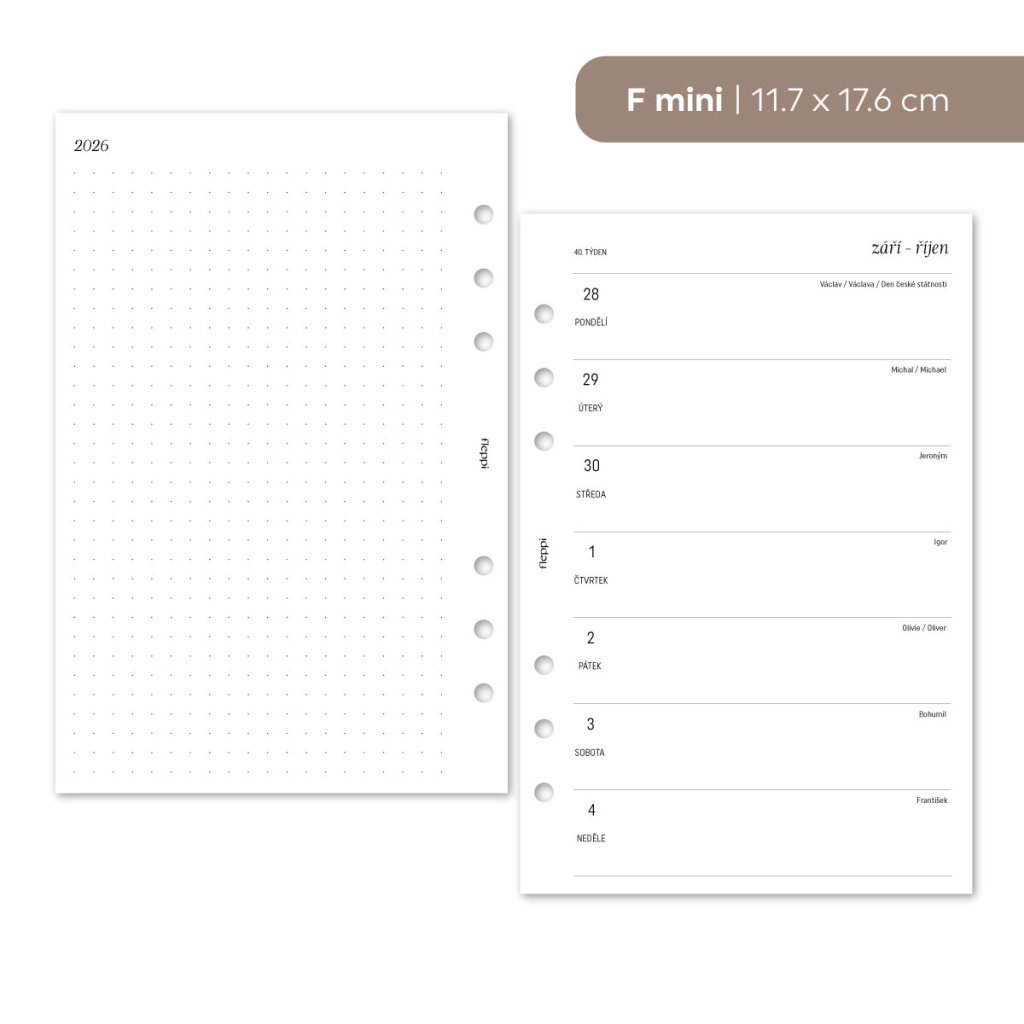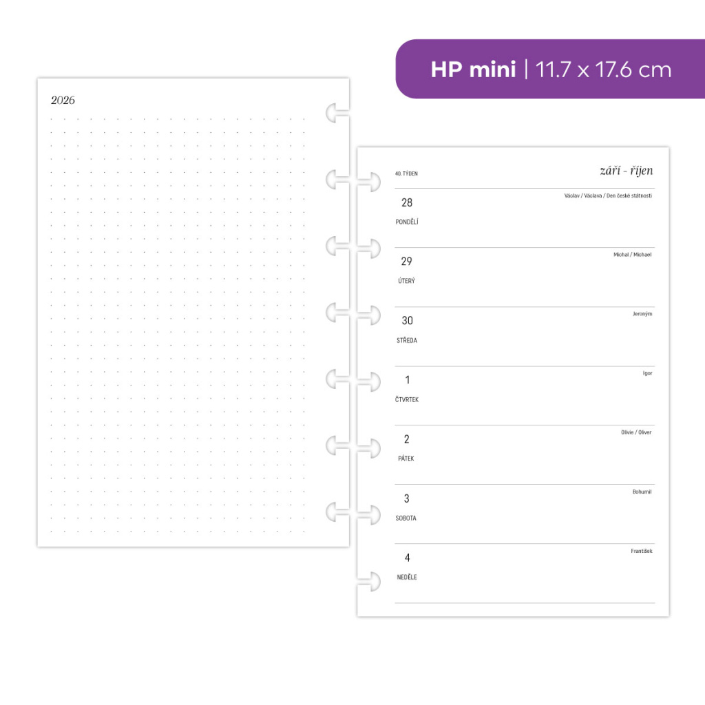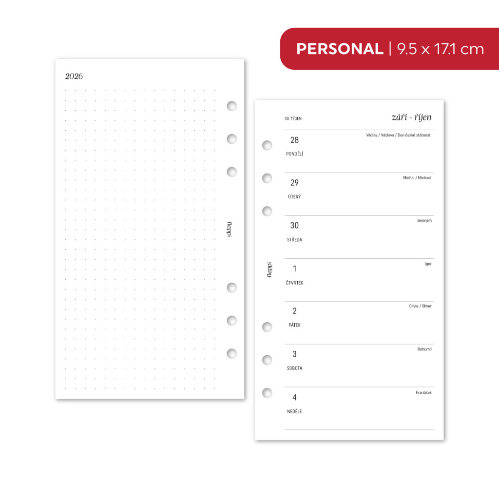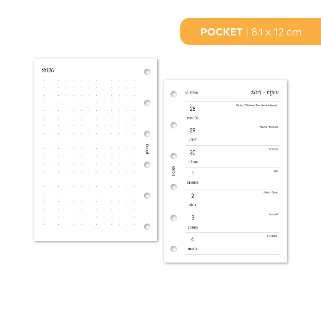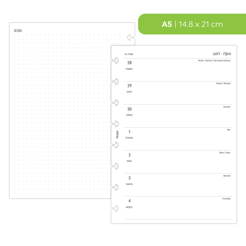 Vstupte do roku 2026 s náplní, která vám dává volnost v plánování i dostatek prostoru pro kreativní myšlenky. Týdenní rozložení s čistými dny na jedné straně vám umožní zapisovat si úkoly, schůzky či poznámky přesně tak, jak potřebujete, bez předtištěných rozvrhů. Tečkované poznámky na druhé straně vám pak poskytnou flexibilní prostor pro seznamy, nápady nebo rychlé skici. Tento formát je ideální pro všechny, kteří chtějí kombinovat přehledné plánování s osobním přístupem k organizaci.