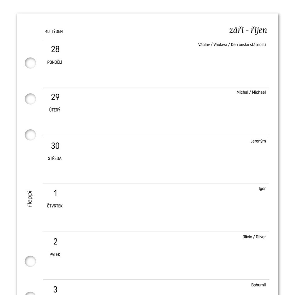 Naše náplně do diářů vám umožní přizpůsobit plánování přesně podle vašich potřeb a stylu. Základní kalendář nabízí dny v přehledné posloupnosti, ale pokud preferujete mít jednotlivé měsíce oddělené, můžete si k náplni přikoupit praktická rozšíření pro jejich rozdělení. Chcete mezi měsíce přidat rozdělovače nebo plánovací listy? Žádný problém.