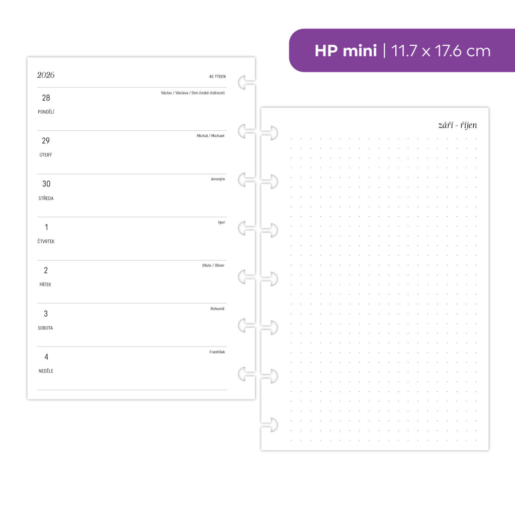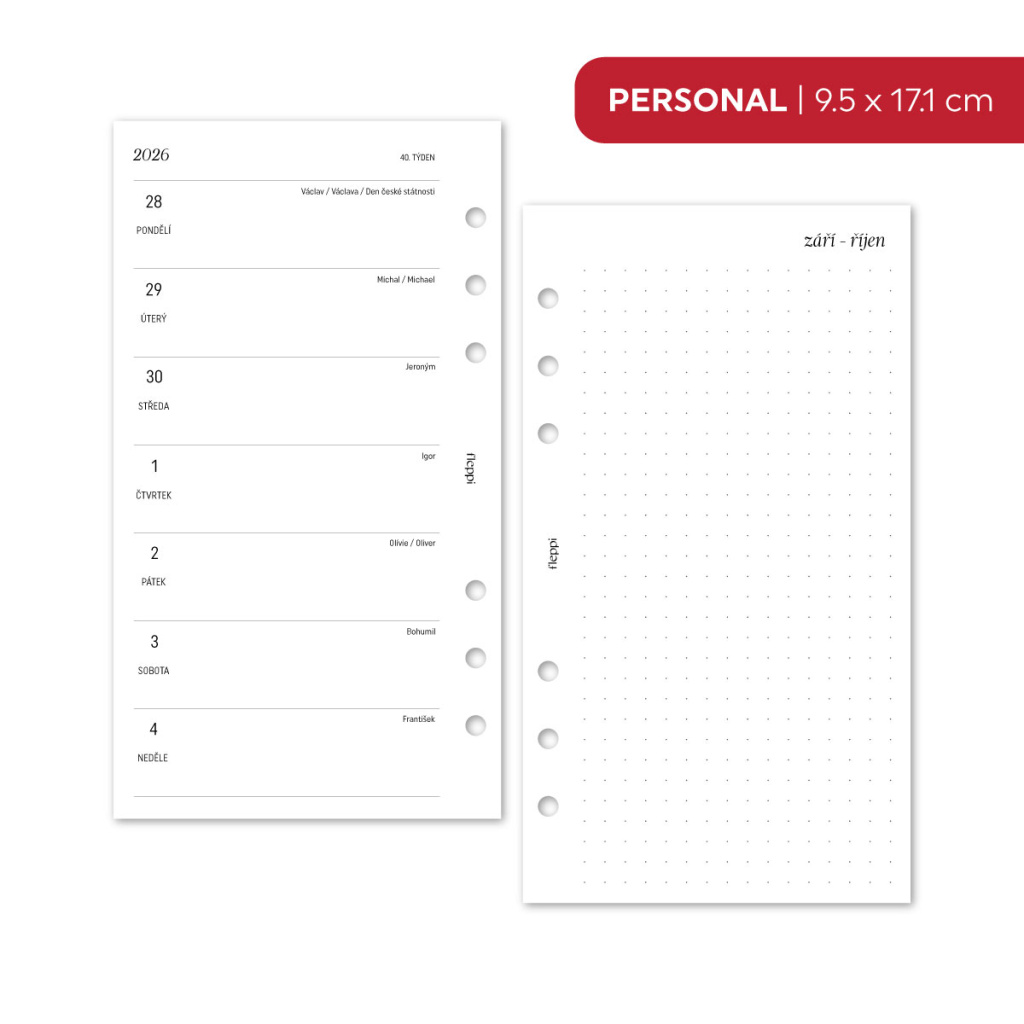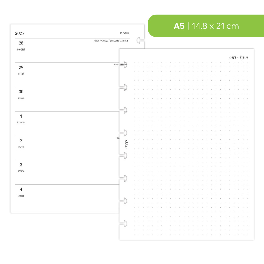 Vstupte do roku 2026 s náplní, která vám dává volnost v plánování i dostatek prostoru pro kreativní myšlenky. Týdenní rozložení s čistými dny na jedné straně vám umožní zapisovat si úkoly, schůzky či poznámky přesně tak, jak potřebujete, bez předtištěných rozvrhů. Tečkované poznámky na druhé straně vám pak poskytnou flexibilní prostor pro seznamy, nápady nebo rychlé skici. Tento formát je ideální pro všechny, kteří chtějí kombinovat přehledné plánování s osobním přístupem k organizaci.