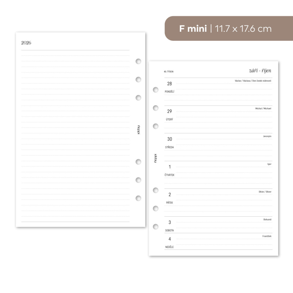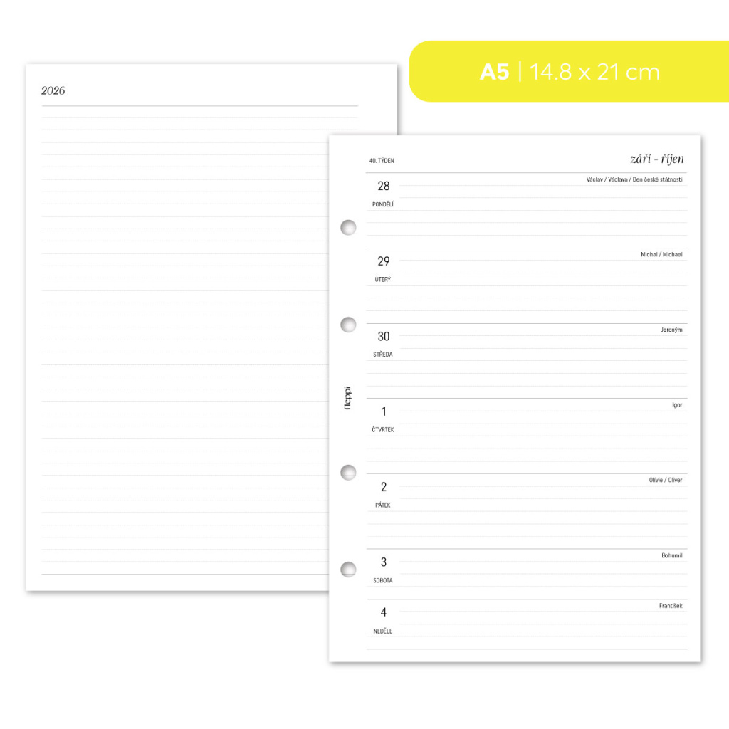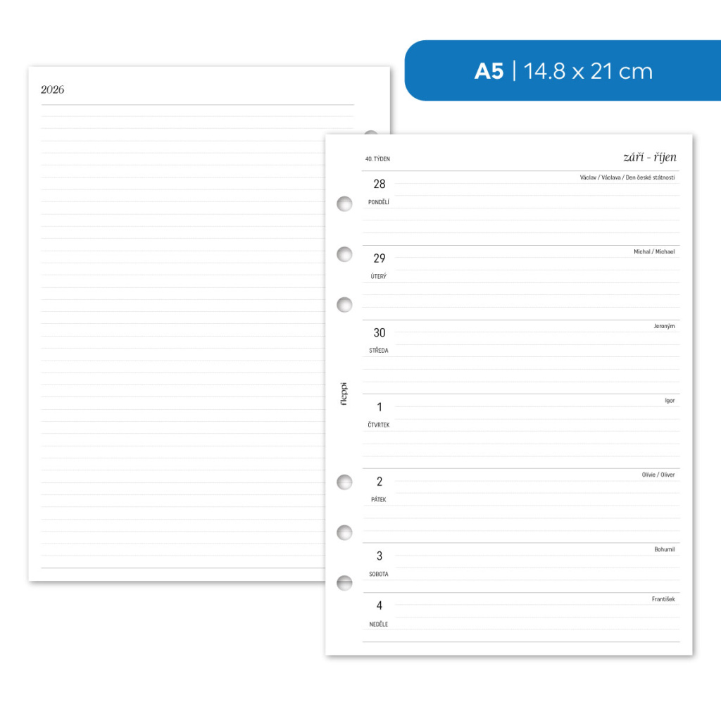 Vstupte do roku 2026 s náplní, která spojuje přehledné plánování s dostatkem prostoru pro vaše poznámky. Týdenní rozložení vám umožní snadno si uspořádat svůj program, zatímco linkované poznámky vlevo poskytují ideální místo pro úkoly, myšlenky nebo důležité detaily. Díky tomuto formátu máte vše pod kontrolou – jasný přehled o týdnu i flexibilitu pro vlastní zápisky. Ať už si vedete diář pro práci, studium nebo osobní organizaci, tato náplň vám pomůže mít všechno na jednom místě a vždy po ruce.