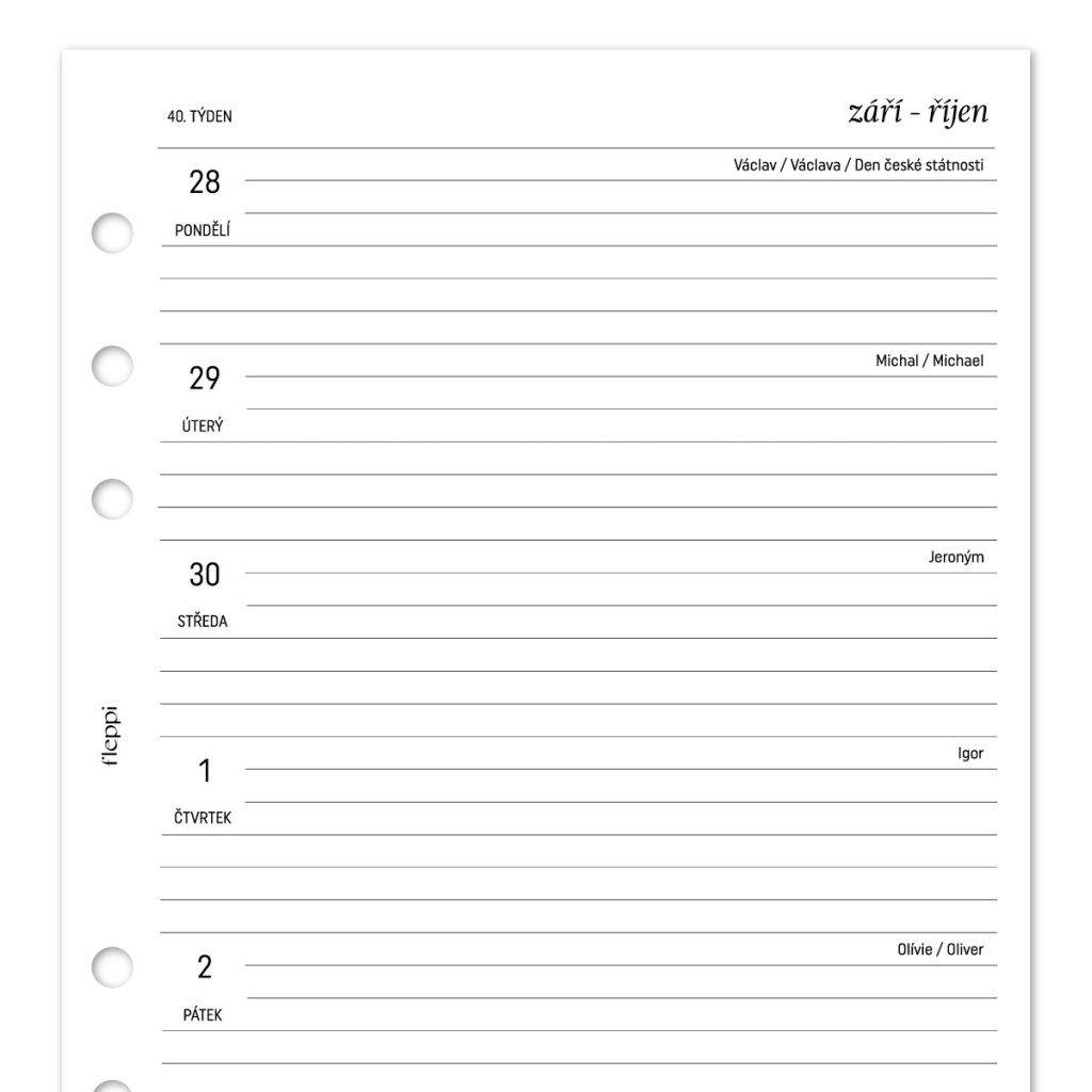 Tato náplň do diáře není jen o týdenním kalendáři – nabízí vám mnohem víc. Na začátku vás čeká úvodní stránka, kam si můžete zapsat své jméno a kontakt, aby se vám mohl diář v případě ztráty opět vrátit. Dále obsahuje praktický list pro zaznamenání důležitých informací, jako je vaše adresa, e-mail, telefonní číslo, číslo účtu nebo kontakty související se zaměstnáním, podnikáním či školou. Součástí je také rychlý přehled celého roku, který vám umožní snadno si naplánovat dlouhodobé události. Nechybí ani výpis státních svátků a volných dnů, takže budete mít všechny důležité termíny na očích. Pro každého, kdo si potřebuje zaznamenat důležité termíny nebo informace k jednotlivým měsícům, je zde přehledná dvoustrana – ideální pro rychlý zápis klíčových dat či plánů. Na konci náplně najdete několik volných listů pro vaše poznámky, kam můžete zapisovat cokoli, co vás napadne.