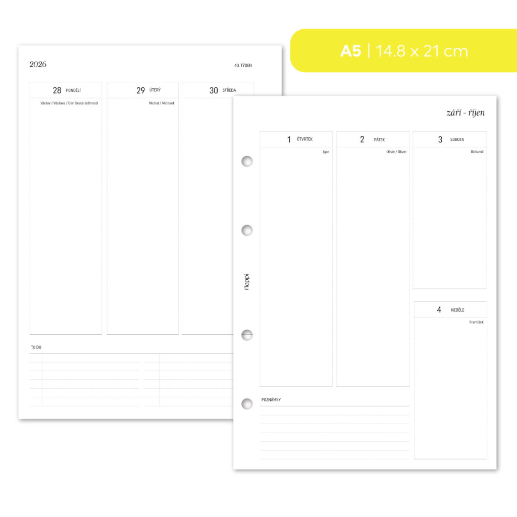 Vstupte do roku 2026 s náplní, která vám nabídne úplnou flexibilitu při plánování. Týdenní rozložení na dvou stranách vám poskytne přehled o celém týdnu na jednom místě, a přitom vám dá svobodu, jak si každý den zorganizujete. Čisté dny bez předtištěných rozpisů vám dávají možnost napsat si vše podle svého, ať už jde o úkoly, nápady, nebo jakýkoli jiný obsah, který potřebujete mít na očích. S tímto uspořádáním si svůj diář přizpůsobíte tak, jak to vyhovuje právě vám. Ať už plánujete pracovní den, osobní projekty nebo si zapisujete inspirativní myšlenky, díky čistým stránkám budete mít možnost si vše detailně přizpůsobit.