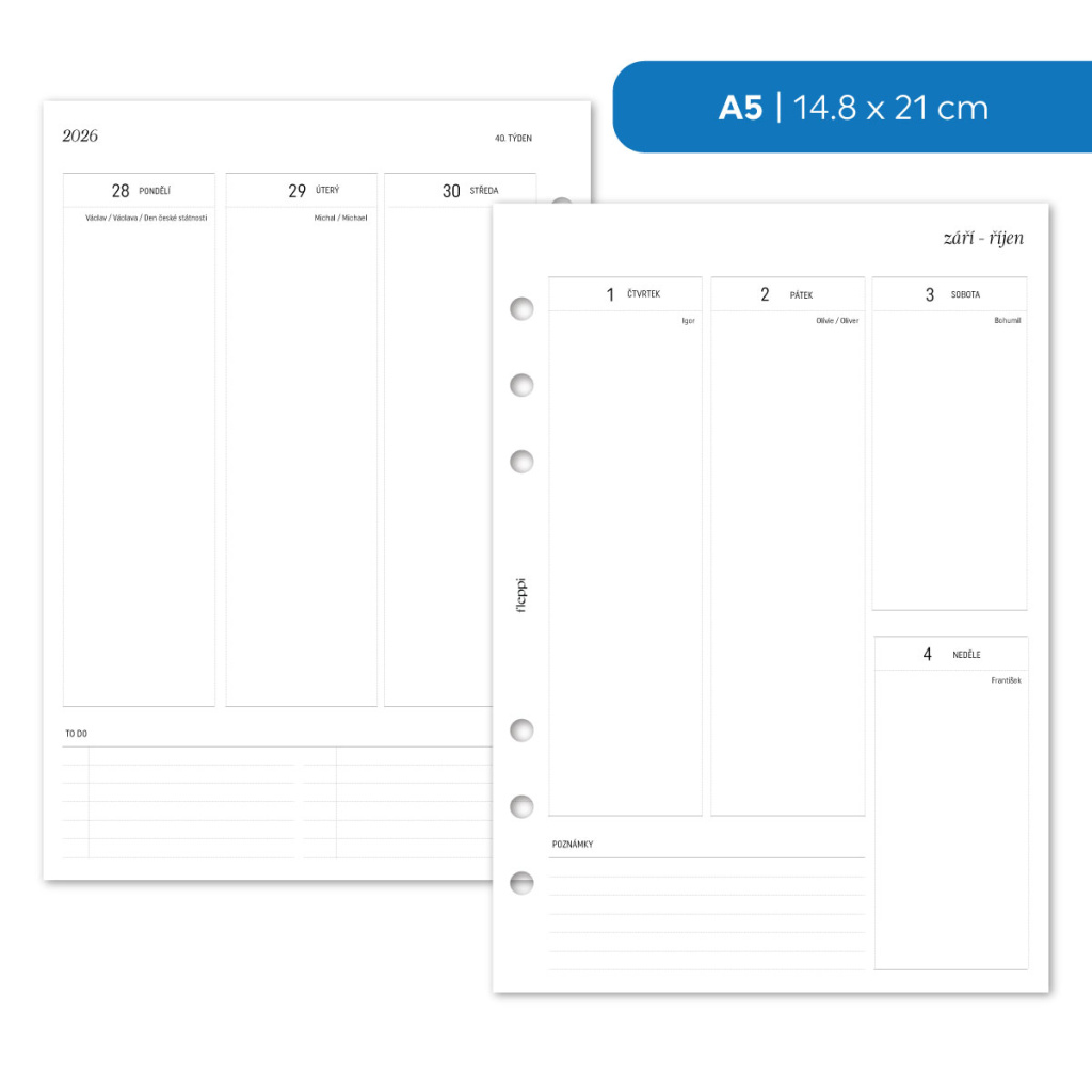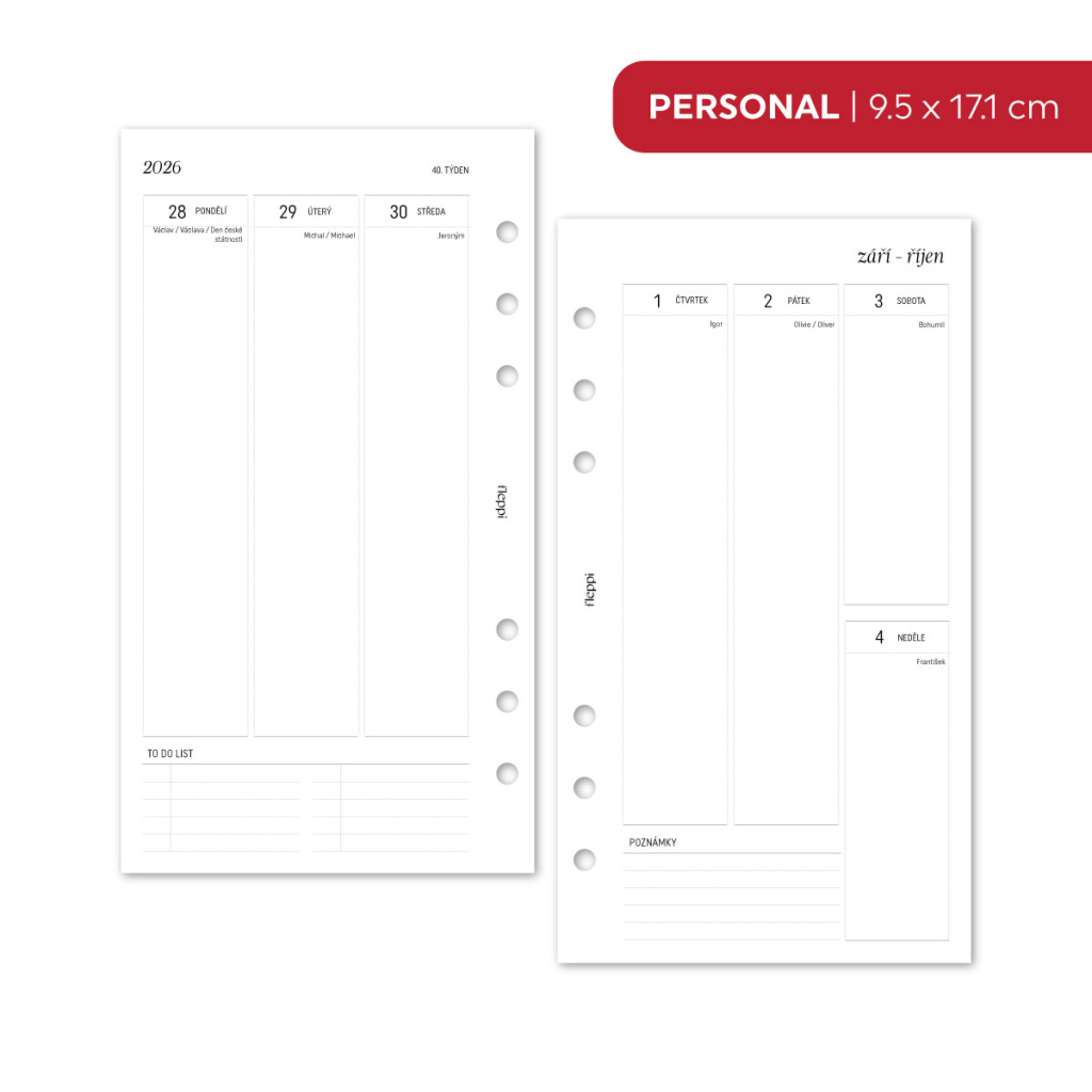 Tato náplň do diáře není jen o týdenním kalendáři – nabízí vám mnohem víc. Na začátku vás čeká úvodní stránka, kam si můžete zapsat své jméno a kontakt, aby se vám mohl diář v případě ztráty opět vrátit. Dále obsahuje praktický list pro zaznamenání důležitých informací, jako je vaše adresa, e-mail, telefonní číslo, číslo účtu nebo kontakty související se zaměstnáním, podnikáním či školou. Součástí je také rychlý přehled celého roku, který vám umožní snadno si naplánovat dlouhodobé události. Nechybí ani výpis státních svátků a volných dnů, takže budete mít všechny důležité termíny na očích. Pro každého, kdo si potřebuje zaznamenat důležité termíny nebo informace k jednotlivým měsícům, je zde přehledná dvoustrana – ideální pro rychlý zápis klíčových dat či plánů. Na konci náplně najdete několik volných listů pro vaše poznámky, kam můžete zapisovat cokoli, co vás napadne.