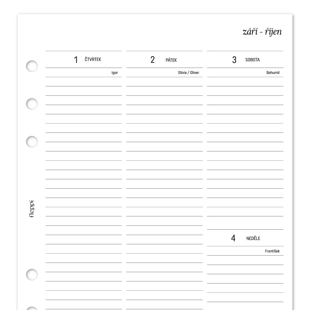 Naše náplně do diářů vám umožní přizpůsobit plánování přesně podle vašich potřeb a stylu. Základní kalendář nabízí dny v přehledné posloupnosti, ale pokud preferujete mít jednotlivé měsíce oddělené, můžete si k náplni přikoupit praktická rozšíření pro jejich rozdělení. Chcete mezi měsíce přidat rozdělovače nebo plánovací listy? Žádný problém.