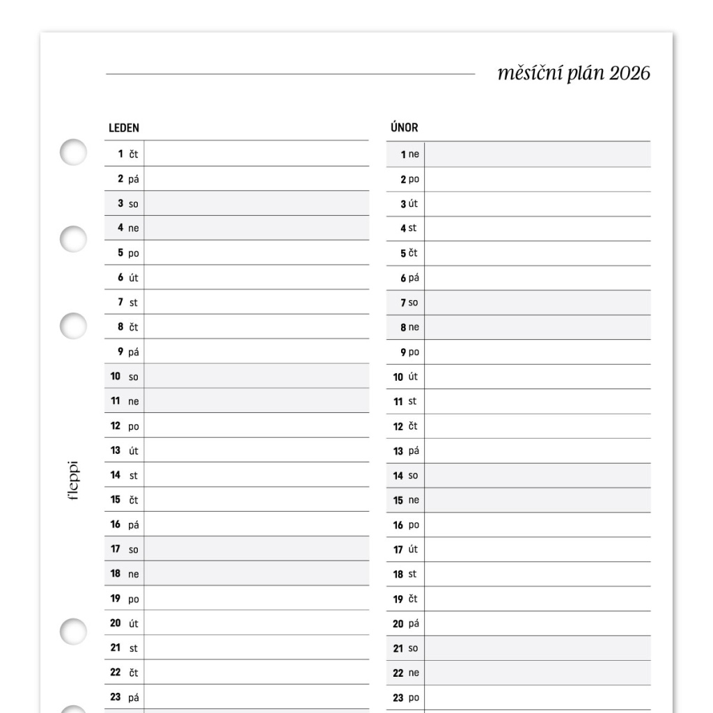 Měsíční plán na rok 2026 a 2027 vám poskytne přehled dvou měsíců na jedné straně, který si snadno vložíte do svého kroužkového diáře. Ideální řešení pro rychlé zaznamenání důležitých akcí, úkolů nebo událostí. Díky této náplni budete mít vše pod kontrolou jedním pohledem.
