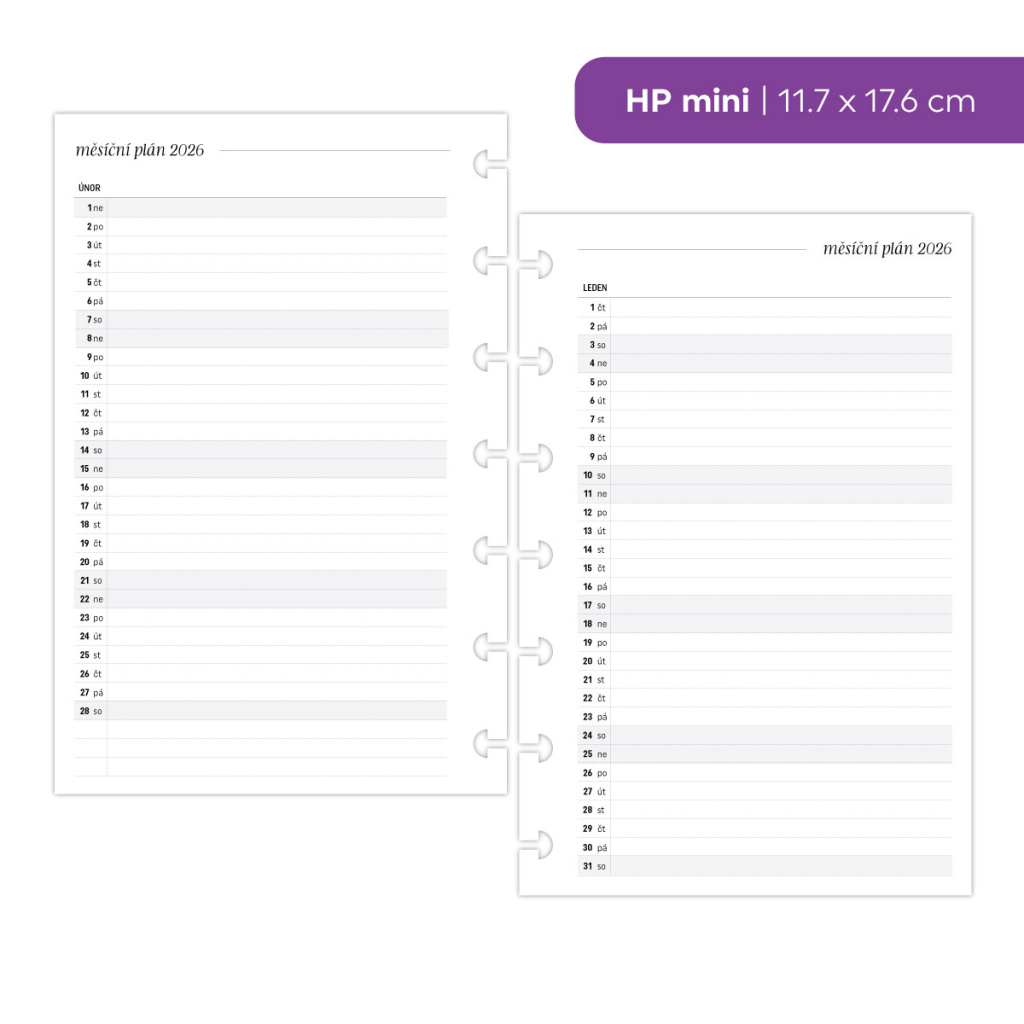 Měsíční plán na rok 2026 jako praktická náplň do vašeho kroužkového diáře, ve které najdete jeden měsíc přehledně na jedné straně. Perfektní pro úvod nebo závěr kalendáře, kde budete mít rychlý přístup ke všem akcím, událostem a úkolům, které potřebujete mít na očích.