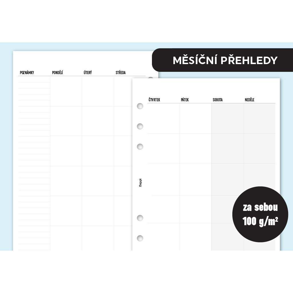 Náhradní náplň do diáře s měsíčními přehledy, se kterými můžete začít plánovat kdykoli během roku. Měsíce na dvoustraně následují hned za sebou, můžete si je tedy vložit na začátek svého týdenního kalendáře. Na úvodní stranu si navíc můžete zapsat své největší plány pro daný rok a na poslední straně najdete 4 to do seznamy.