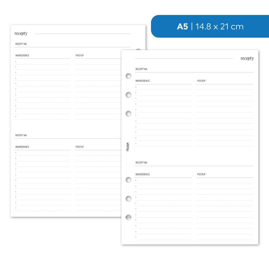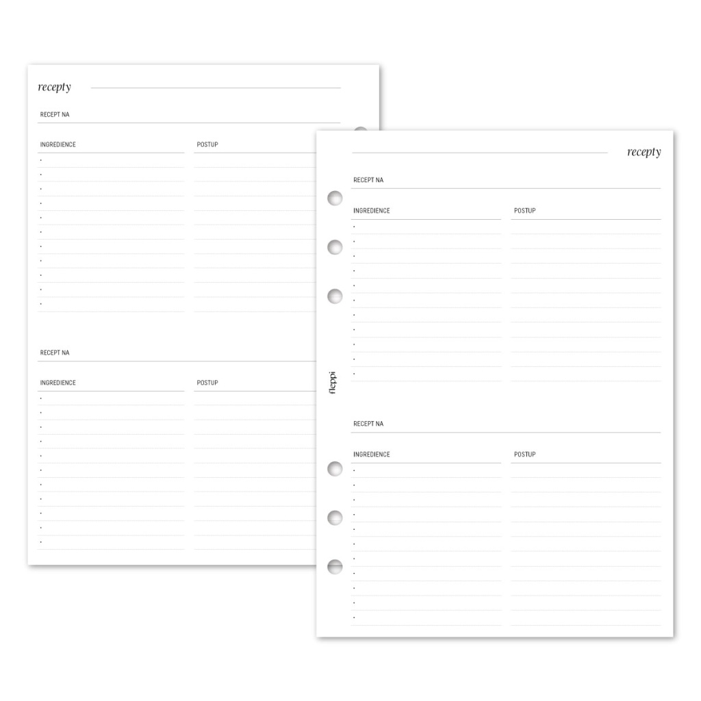 Tato náplň vám umožní mít všechny recepty přehledně uspořádané – jednoduše, čistě a na jednom místě. Každý list má prostor pro název receptu, seznam ingrediencí a postup. Díky této jasné struktuře můžete rychle zaznamenat nápad, uchovat si oblíbený rodinný pokrm nebo sepsat nové jídlo, které vás zaujalo.
