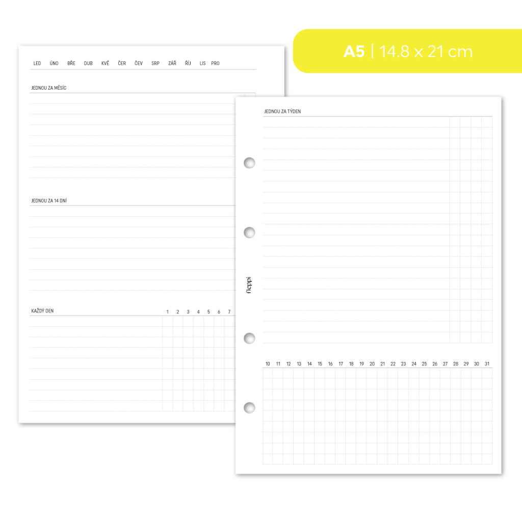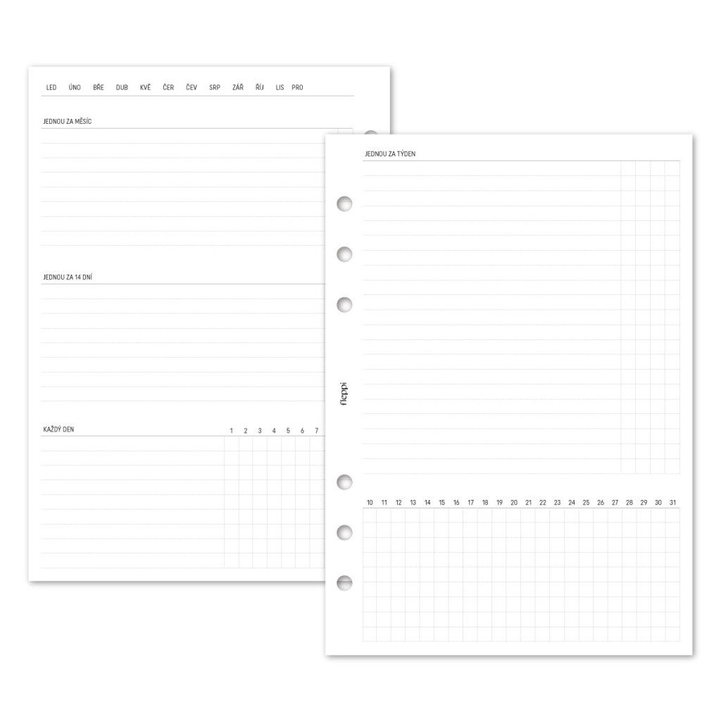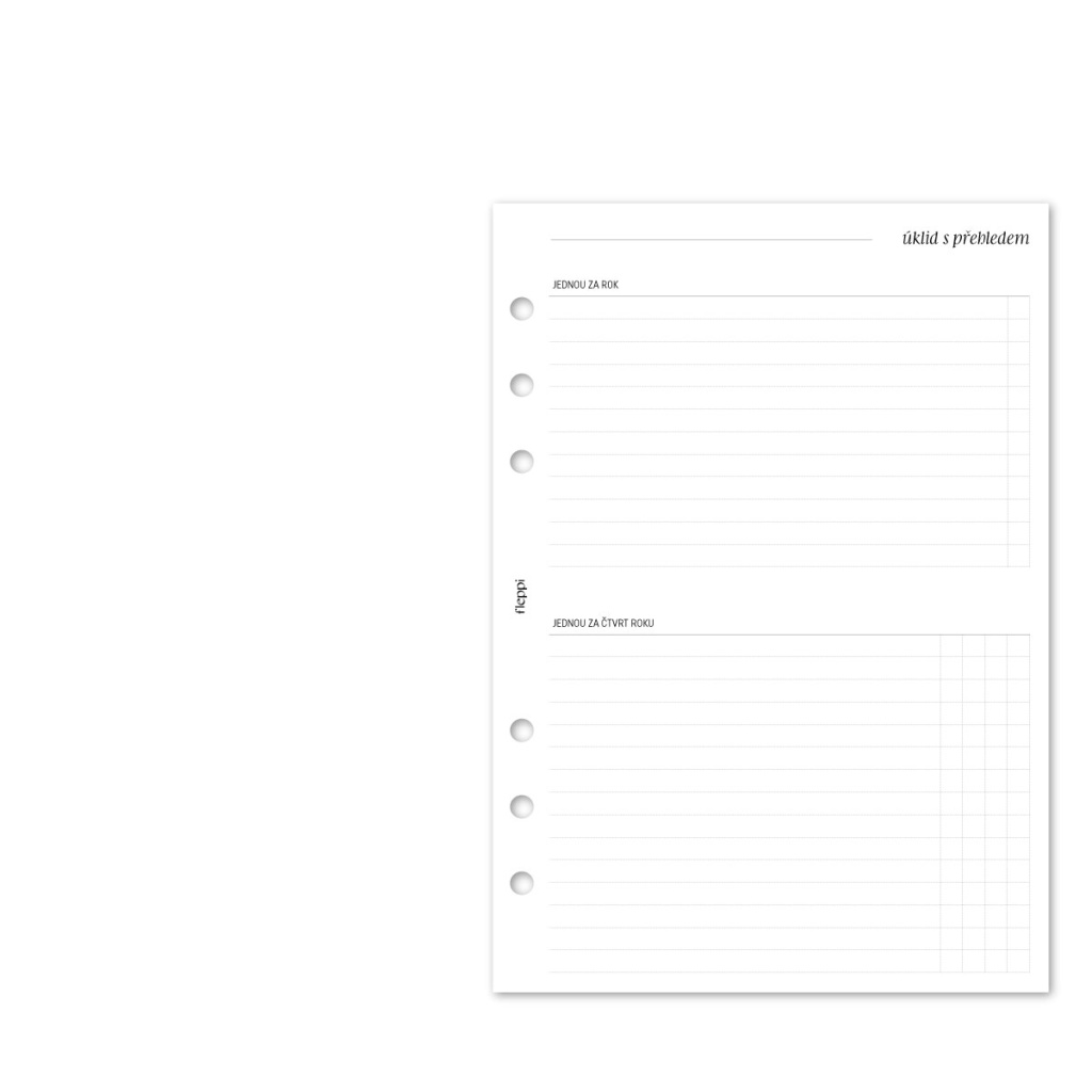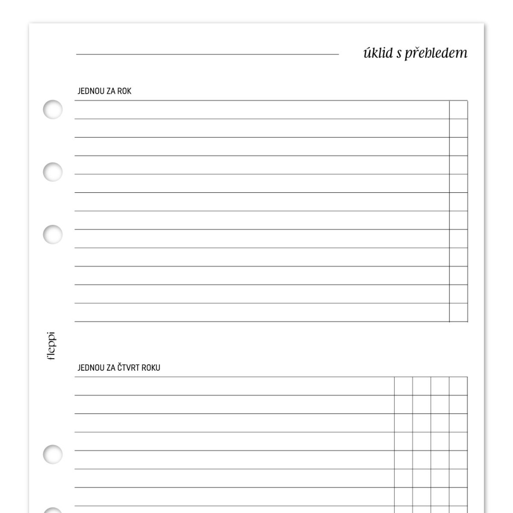 Praktická náplň do diáře, která vám pomůže mít celý domácí úklid pod kontrolou. Už žádné chaotické papírky, poznámky v telefonu nebo hlava plná toho, co všechno je potřeba uklidit. Díky jasně rozvrženým seznamům a tabulkám budete mít úklid přehledně uspořádaný a rozdělený do kroků, které vám pomohou udržovat pořádek po celý rok – systematicky a s lehkostí.