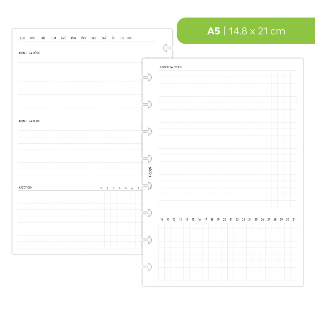 Náplň obsahuje 13 listů. Na začátku náplně najdete praktické to-do listy pro úkoly jednou ročně a jednou za čtvrtletí, které vám pomohou naplánovat velké a sezónní úklidy. Následuje 12 měsíčních dvojlistů, které usnadní zapisování rutinních činností – od těch, které děláte jednou za měsíc, jednou za 14 dní, týdně až po každodenní úklid. Díky tomu budete mít všechny povinnosti přehledně na jednom místě a už se nestane, že byste na něco zapomněli.