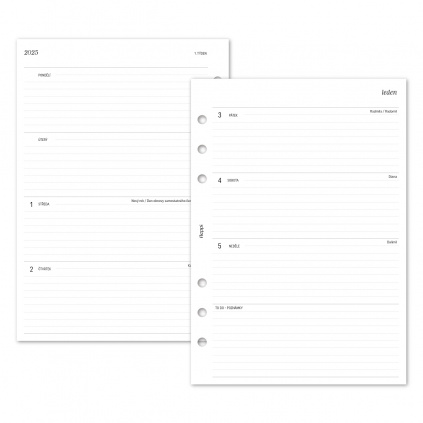 Udržte si pořádek ve svém diáři přesně podle svých potřeb! V naší nabídce náplní do diáře najdete kalendáře na rok 2025, ale i nedatované varianty, které můžete začít používat kdykoliv. Kromě kalendářových náplní si diář snadno rozšíříte o poznámkové listy, tematické listy pro plánování úklidu, cvičení nebo osobního rozvoje a další praktické stránky. Aby byl váš diář nejen přehledný, ale i dobře organizovaný, nechybí rozdělovače pro snadnou orientaci nebo užitečné doplňky, jako jsou děrovačky a zpevňující záplaty. Díky širokému výběru si můžete svůj diář přizpůsobit tak, aby vám dokonale vyhovoval a stal se nepostradatelným pomocníkem při každodenním plánování.