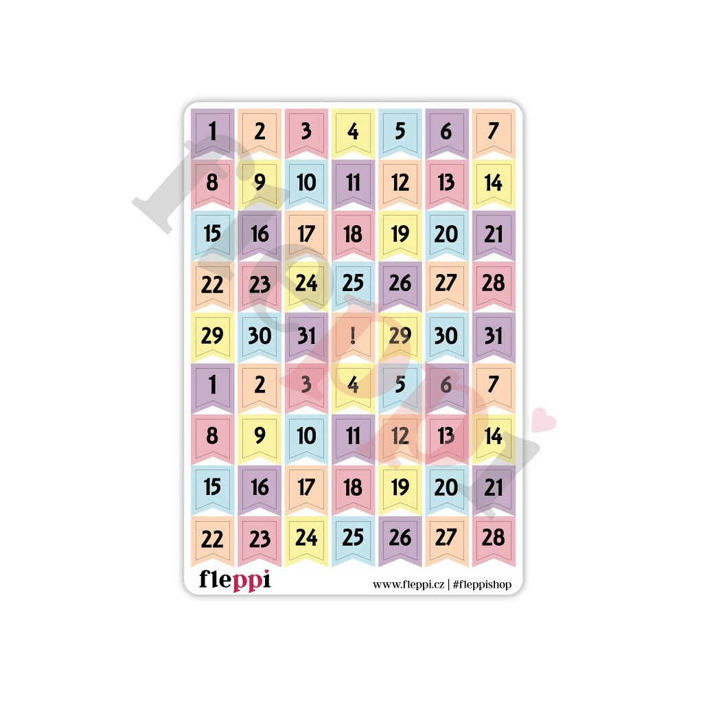 Samolepky čísel ve tvaru vlaječek vám usnadní nadepisování jednotlivých datumů ve vašem nedatovaném diáři. Balení obsahuje samolepky pro vytvoření dvou měsíců, tedy dvakrát čísla 1-31 a jednu samolepku s vykřičníkem.
