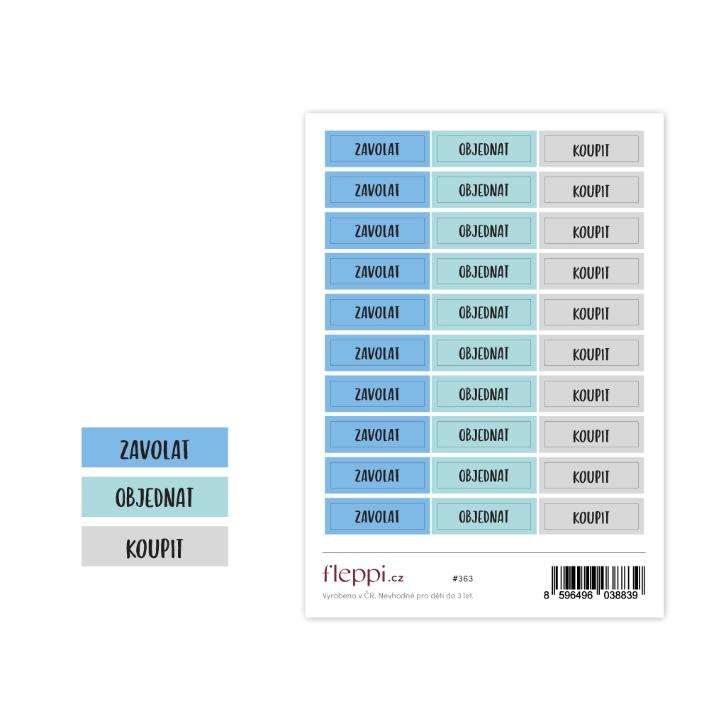 Samolepky Praktické štítky 2 vám usnadní každodenní plánování i organizaci drobných úkolů. Díky textům Zavolat, Objednat a Koupit budete mít jasný přehled o tom, co vyřídit. Barevné provedení oživí váš diář a pomůže vám rychle najít to, co právě potřebujete.