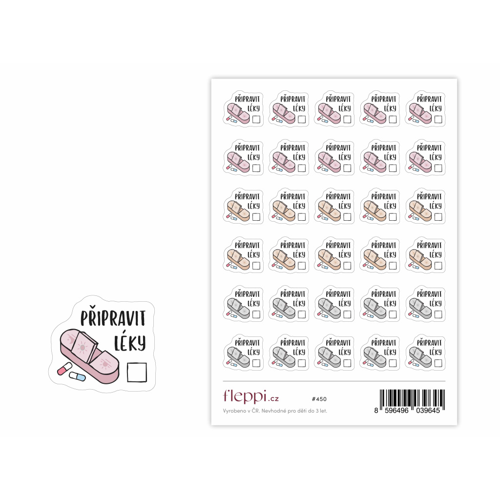 Každá samolepka obsahuje text „PŘIPRAVIT LÉKY“, ilustraci dávkovače a malé zatrhávací políčko. Díky tomu můžete úkol nejen naplánovat, ale i vizuálně potvrdit jeho splnění.