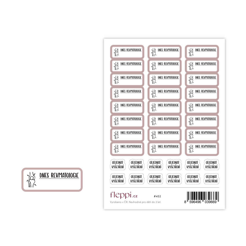 Textové boxy s ikonou kloubu jasně označí den návštěvy lékaře, zatímco menší samolepky „Objednat vyšetření“ připomenou administrativní krok, na který se snadno zapomíná. Vše je přehledné, čitelné a vizuálně sjednocené.