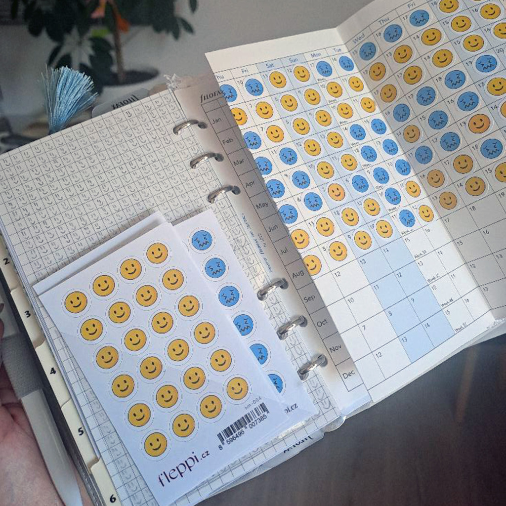 Sada papírových samolepících emoji nálepek. Usmívající se smajlík pro zdobení v diáři i bullet journalu.