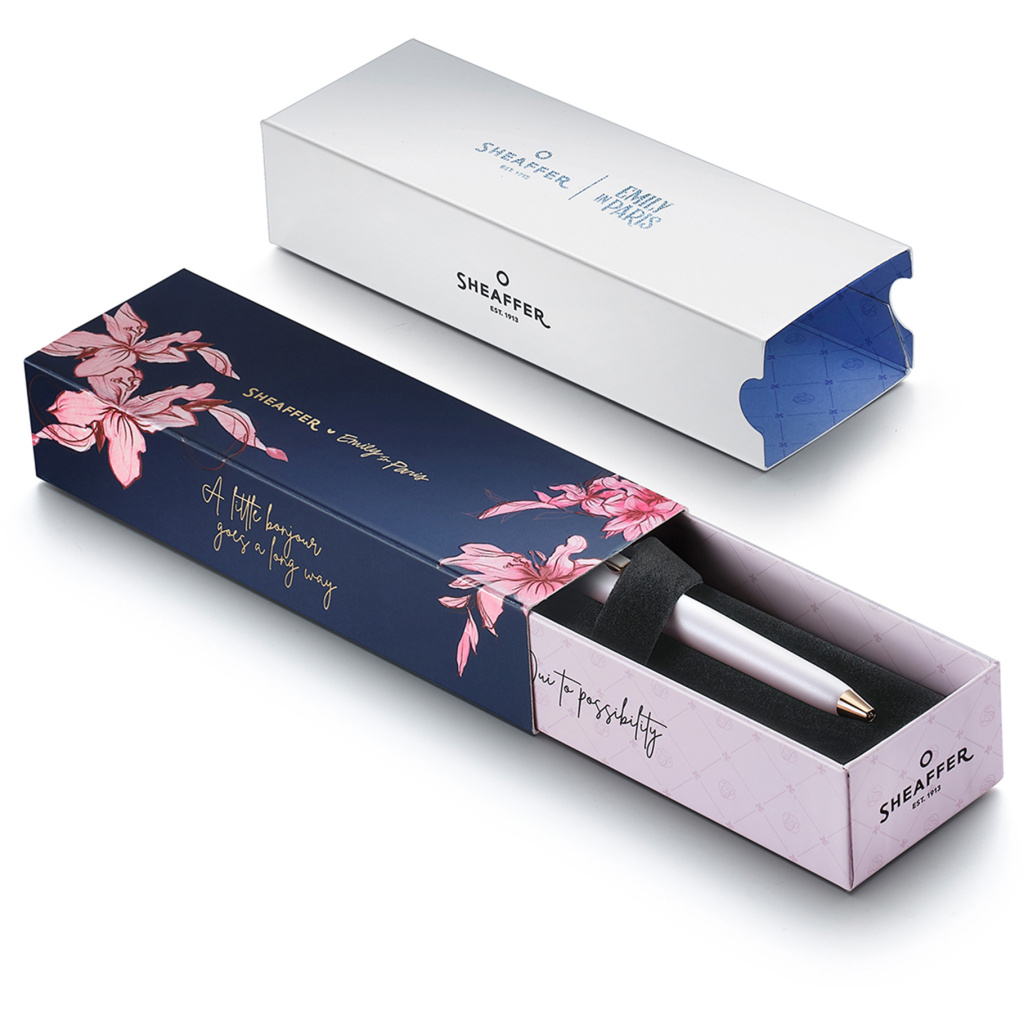 Toto miniaturní kuličkové pero je kompaktní cestovní verzí ikonického modelu Sheaffer Prelude – a dokonale spojuje pařížský šarm s každodenní funkčností. Jemná pastelově růžová barva v kombinaci s růžově zlatými PVD detaily vytváří elegantní celek, který odkazuje na hravou sofistikovanost seriálu Emily v Paříži.