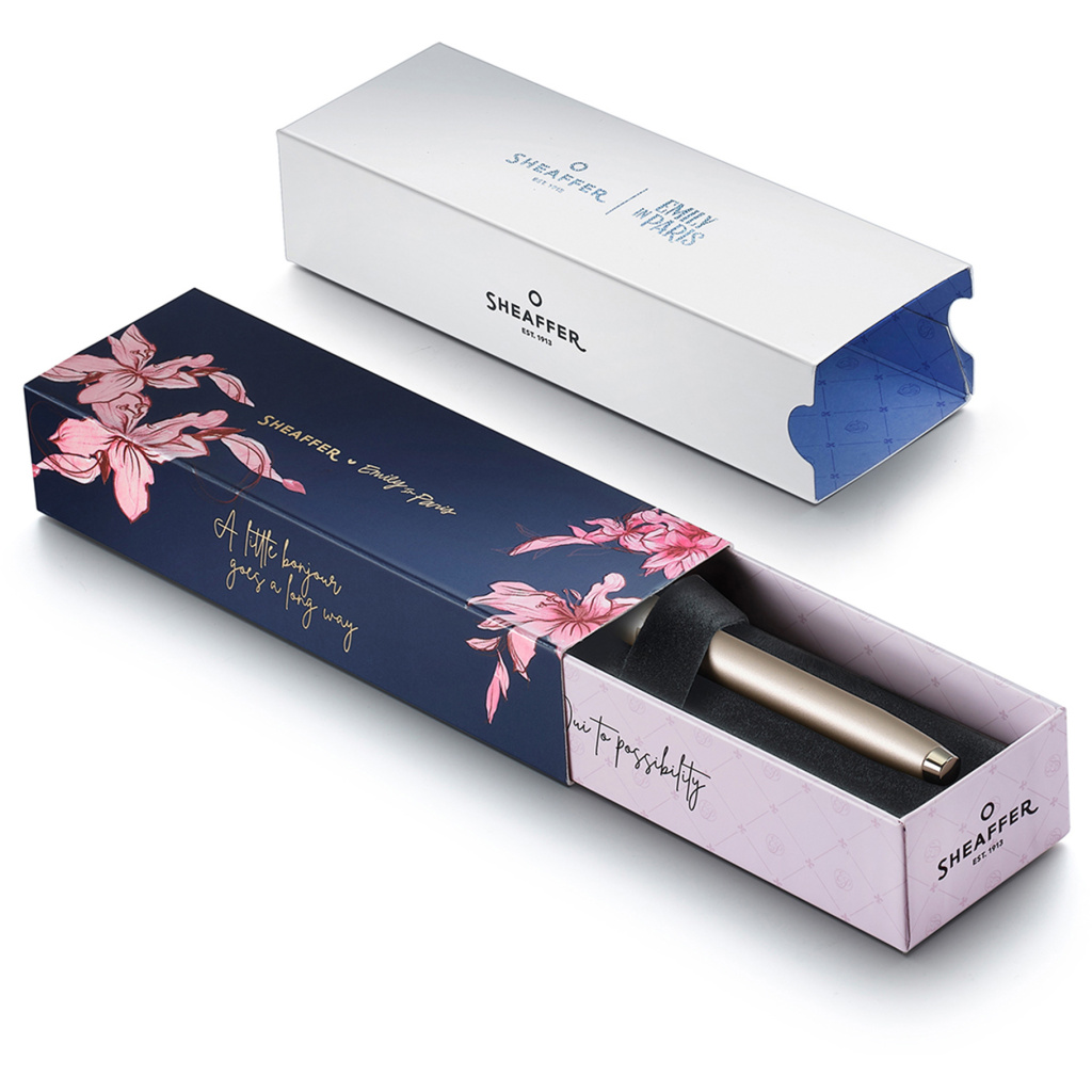 Kolekce per Sheaffer 100 byla přepracována do zářivé barvy Champagne Gold s lesklými doplňky a ozdobami pro speciální edici Emily in Paris. Toto plnicí pero, které bylo navrženo tak, aby proměnilo každodenní psaní v okamžik požitku, je synonymem nenápadné elegance a nenuceného symbolu. Na klipu se pyšně skví charakteristický emblém ve tvaru mašle – pocta ikonickému stylu Emily – zatímco středový kroužek s logem obou značek dodává této klasické siluetě sběratelskou hodnotu. Hladké, vyvážené a snadno si ho zamilujete. Je určeno pro ty, kteří mají rádi svá slova s trochou extra jiskry.