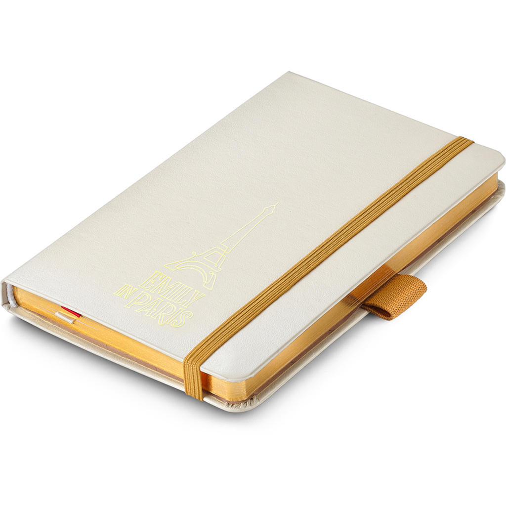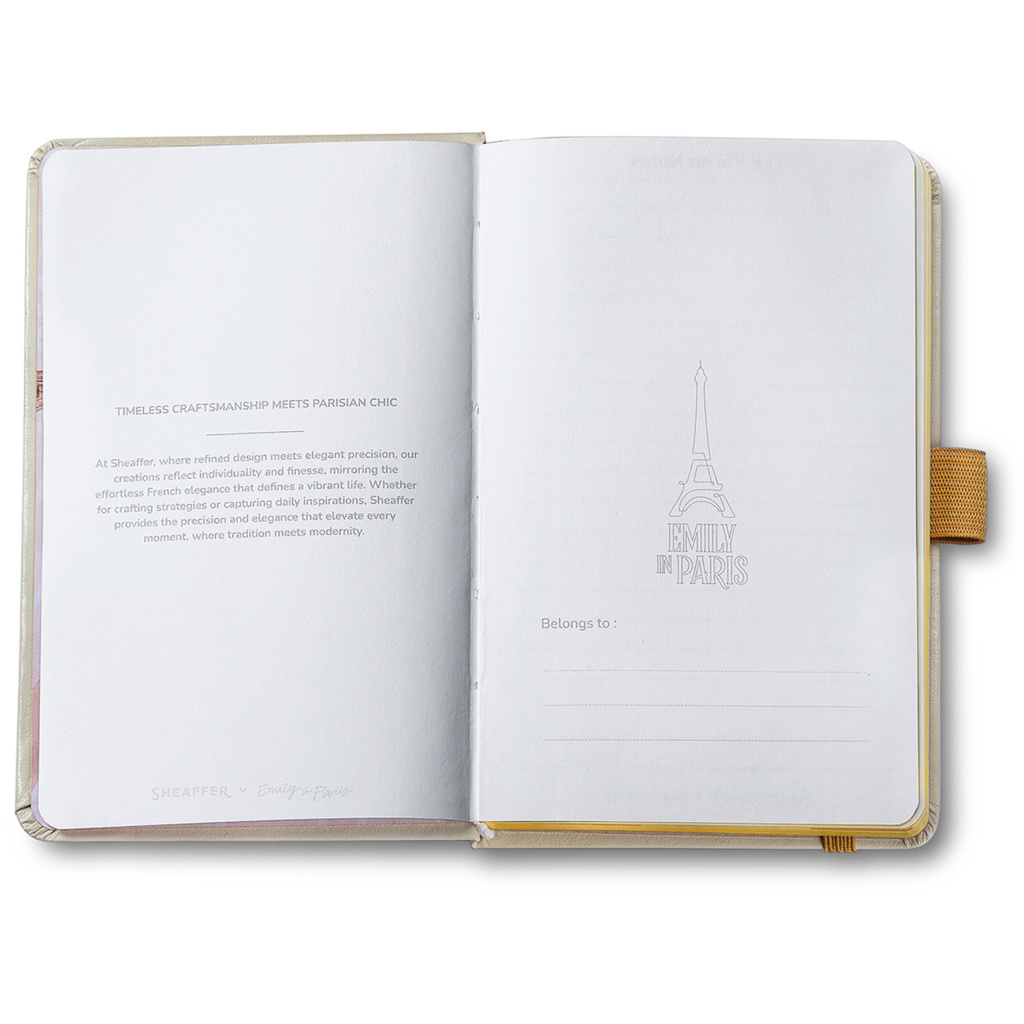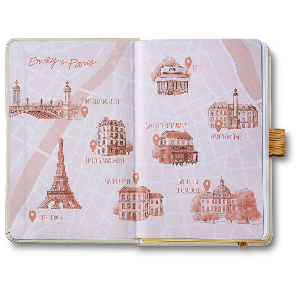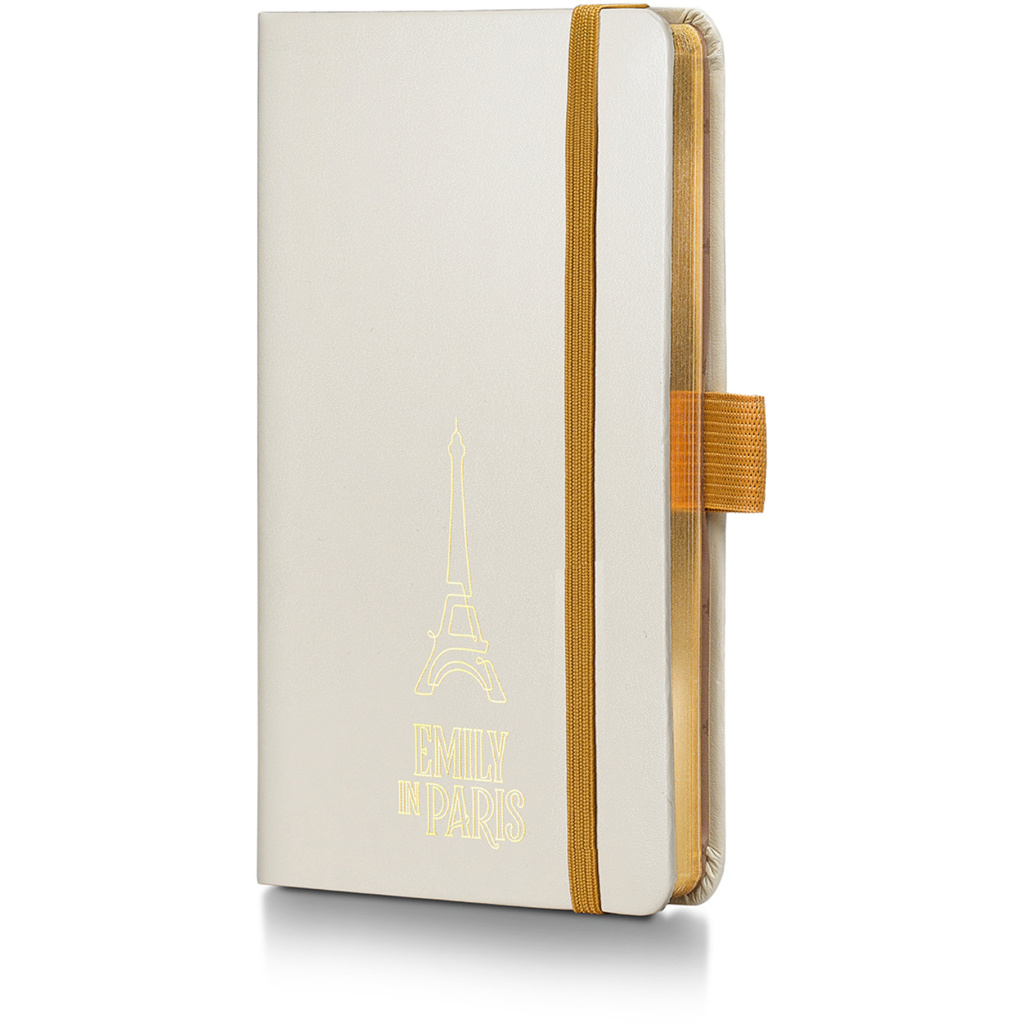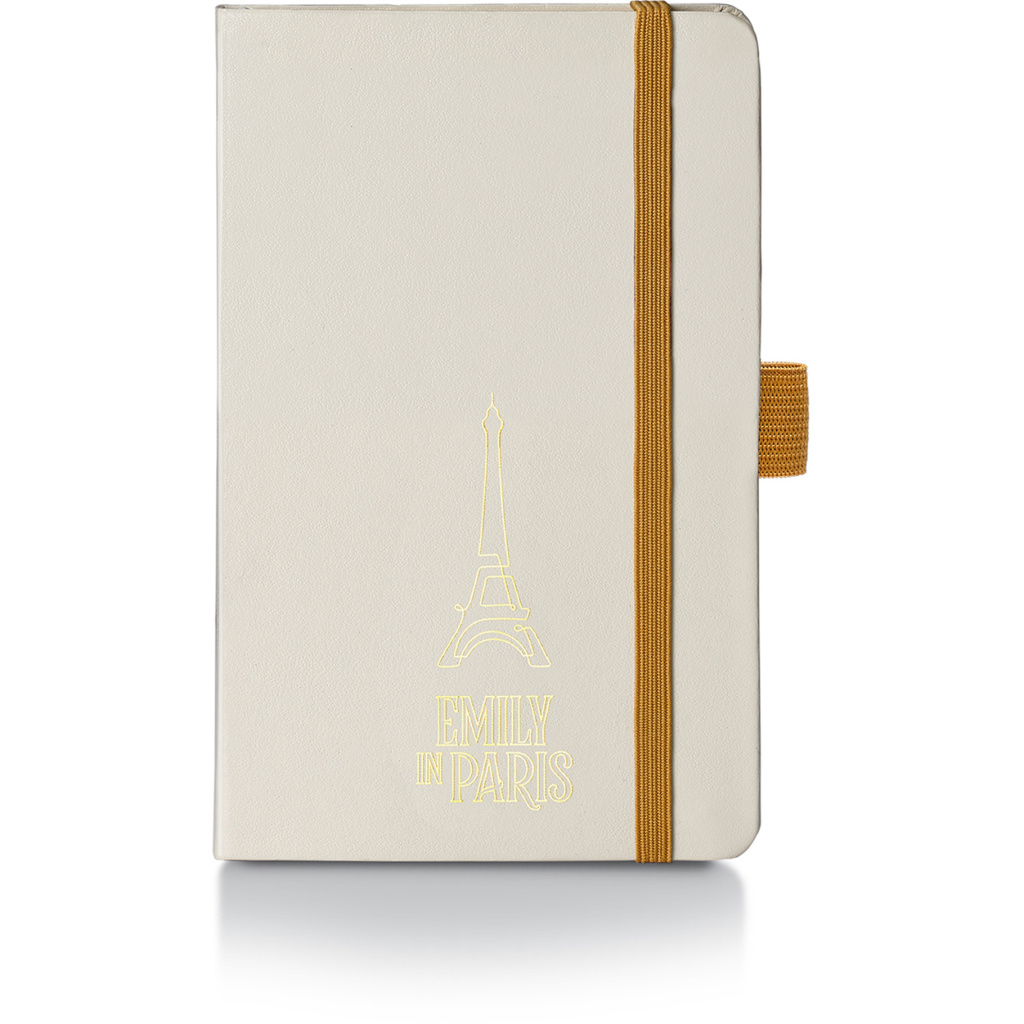 - Desky zdobí zlatý fóliový potisk s monogramem Emily in Paris a Eiffelovy věže