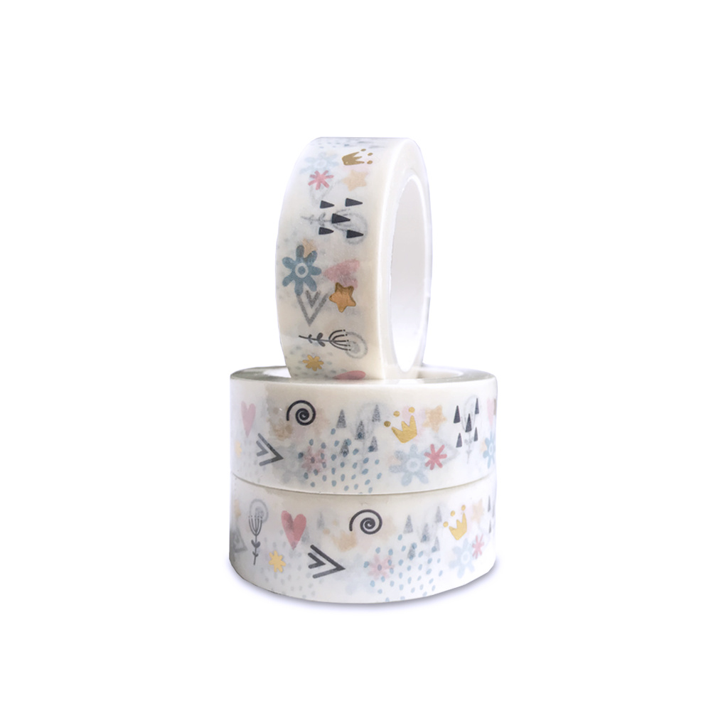 Bílá washi páska s jemným vzorem se zlatou ražbou.